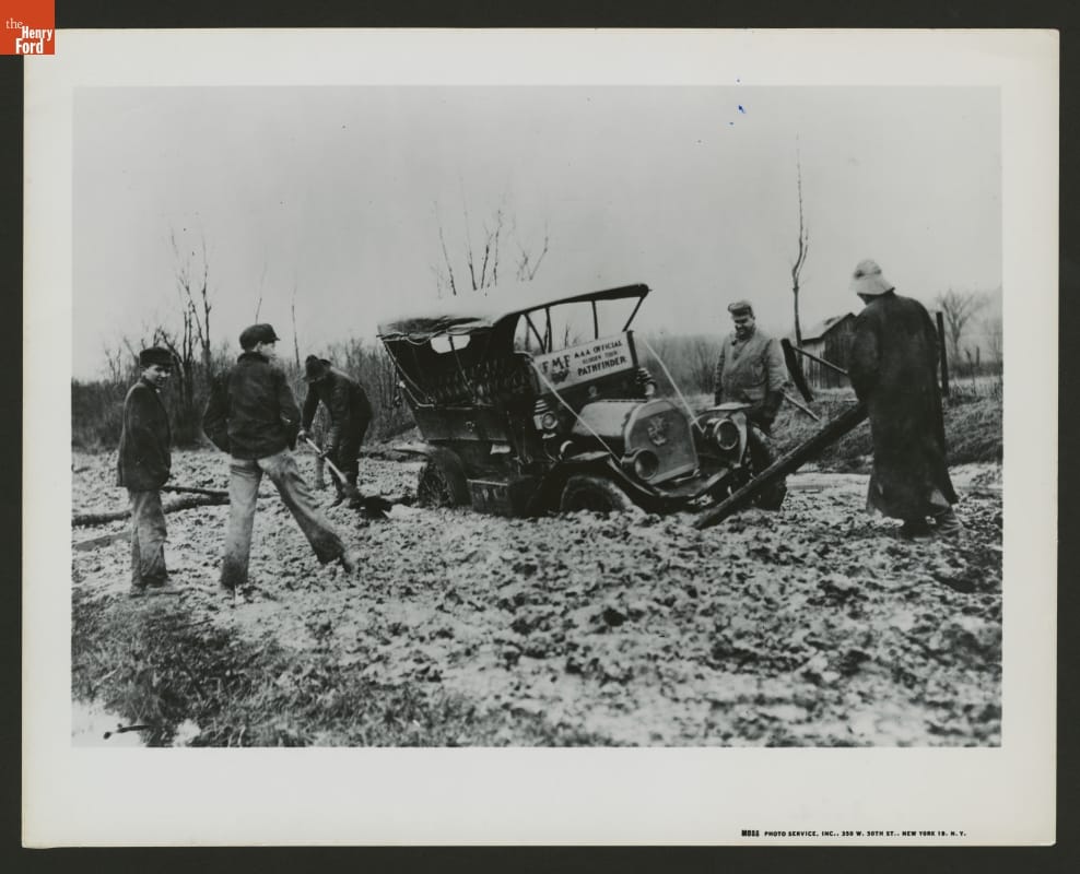 This photograph from 1910 shows the Automobile Association of America's (AAA) Official Glidden Tour Pathfinder vehicle stuck in the mud. The AAA organized Glidden Tours from 1904 through 1913. These grueling endurance runs of several hundred miles brought attention to the poor condition of American roads.