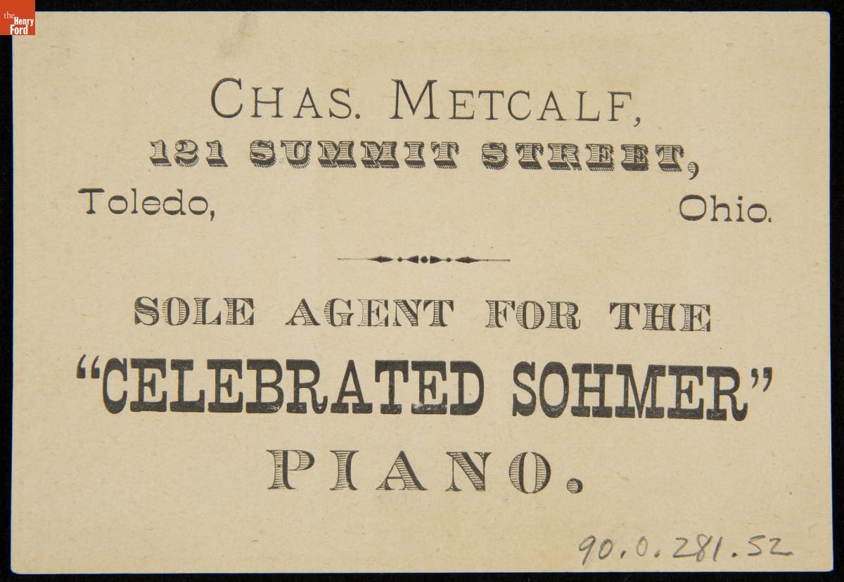 Product made by Sohmer Piano Company. Sold by Sharles Metcalf, Toledo, Ohio.