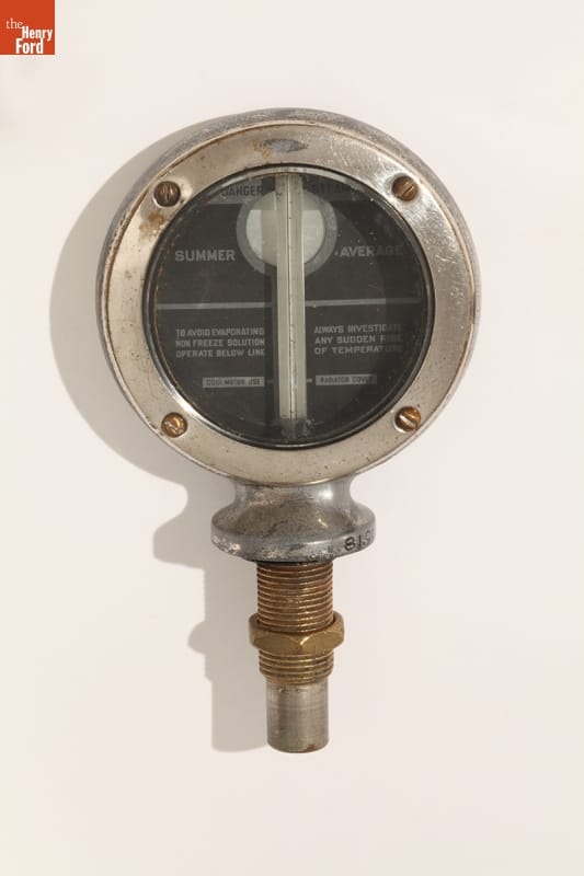 Automobiles often came without temperature gauges before the early 1930s, so enterprising manufacturers sold aftermarket motometers. Mounted on a car's radiator, these devices measured and displayed coolant water vapor temperature, notifying drivers if their automobiles were in danger of overheating. Moto-Meter Co. Inc. dominated the American market, producing the popular Boyce motometer and others featuring an automotive manufacturer's name or logo.