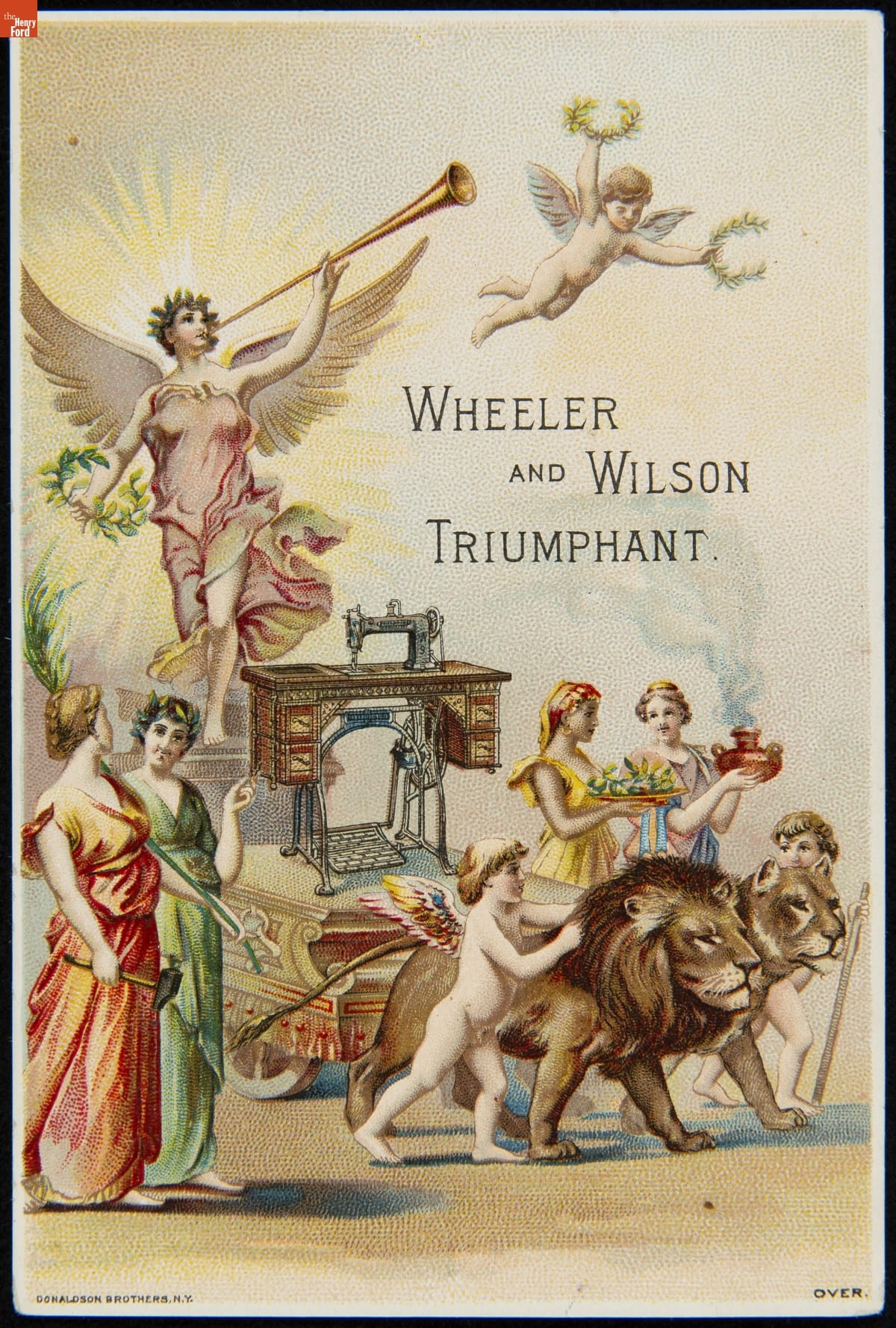 As color printing gained momentum in the late 19th century, trade cards became a major means of advertising goods and services. Americans enjoyed and often saved the little advertisements found in product packages or distributed by local merchants. This trade card advertises products available from Wheeler & Wilson Manufacturing Company.