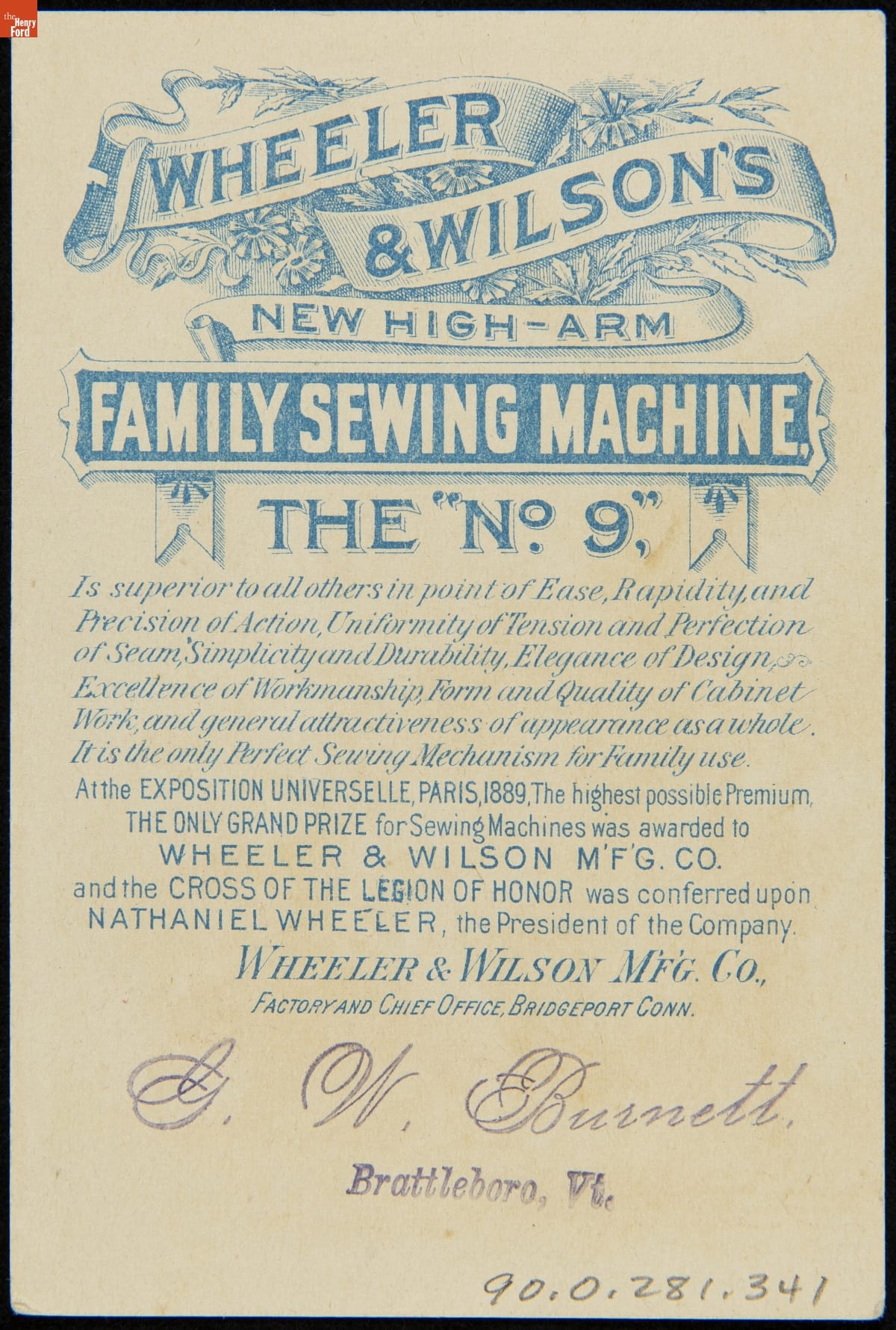 Manufactured by Wheeler & Wilson Manufacturing Company, Bridgeport, Connecticut. Retailed by G.W. Burnett, Brattleboro, Vermont. Lithographed by Donaldson Brothers, New York, New York.