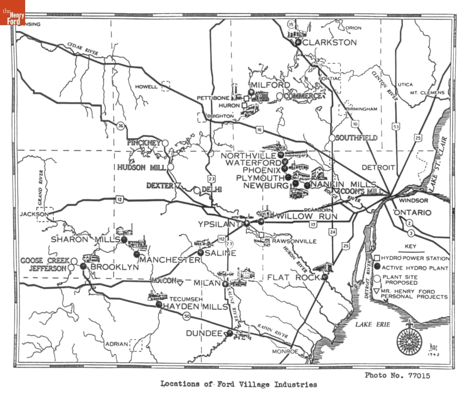 In the 1920s and '30s, Henry Ford set up small-scale factories to supply Ford with needed tools and vehicle parts. He scattered these "Village Industries" throughout southeast Michigan usually along rivers. Ford employed local residents -- ideally farmers who could maintain their farms when not working at the factory. This map shows the factories Ford had created by 1942.