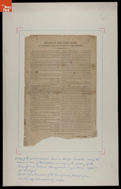 Description beneath: A copy of the printed broadside issued in 1847 for circulation among the business men of Philadelphia and urging the necessities and advantages of the Pennsylvania Railroad, with arguments designed to win support for the project./ Cornerstone document of the present Pennsylvania Railroad System. No other copy bibliographically recorded. Signed by T.P Cope, Chairman of the Commissioners./ Published in Philadelphia. Date: 1847.