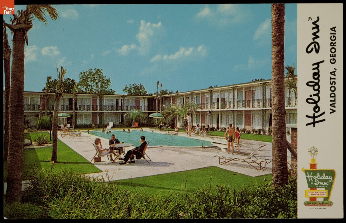 Holiday Inn, founded in 1952, set the model for nationally franchised motel chains that were moderately priced, comfortably furnished, and consistently managed. This postcard from the 1960s show one of the chain's motels in Valdosta, Georgia. The visitor wrote that he stayed for two nights. His previous night's stay was at a Holiday Inn in Tennessee.