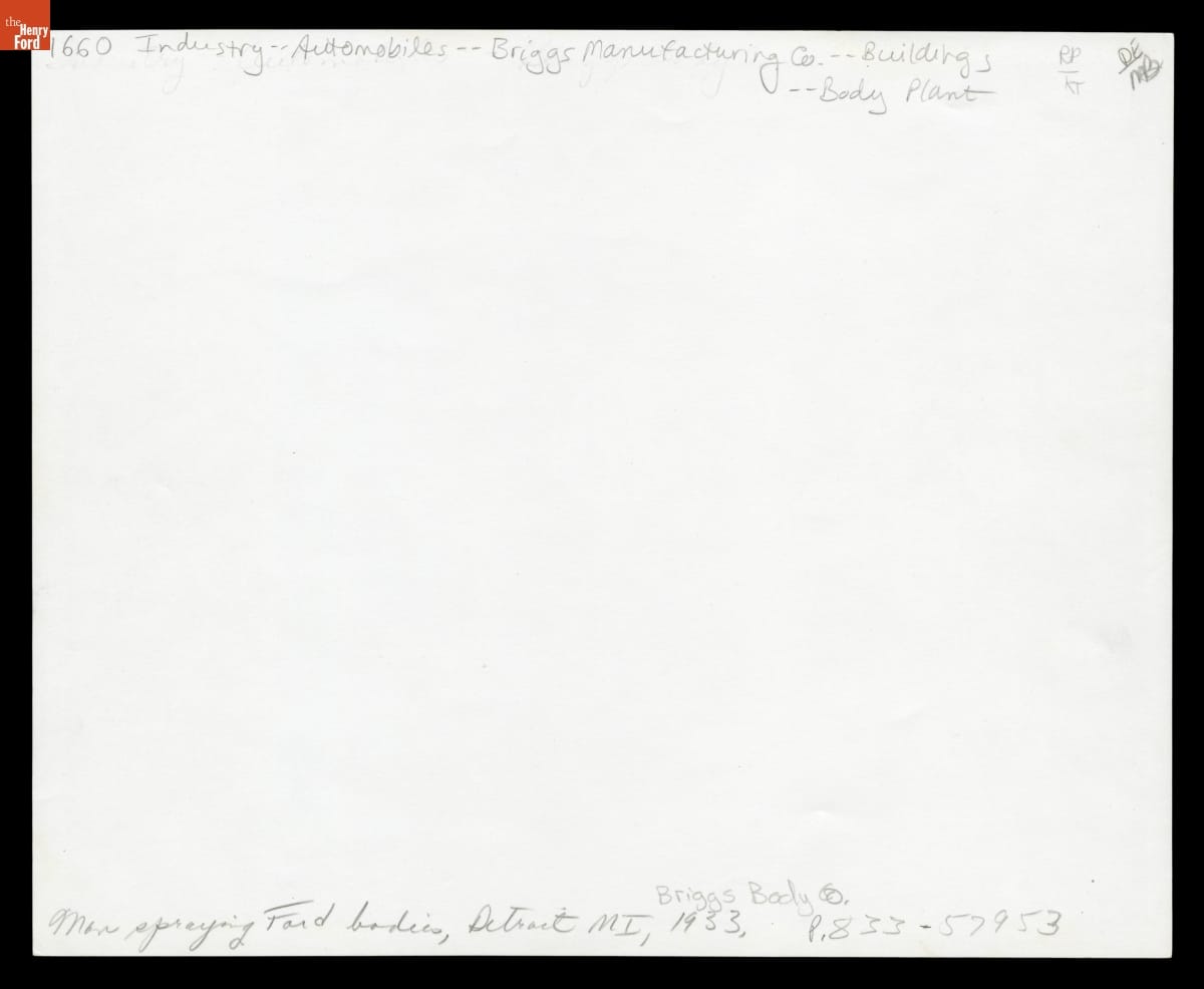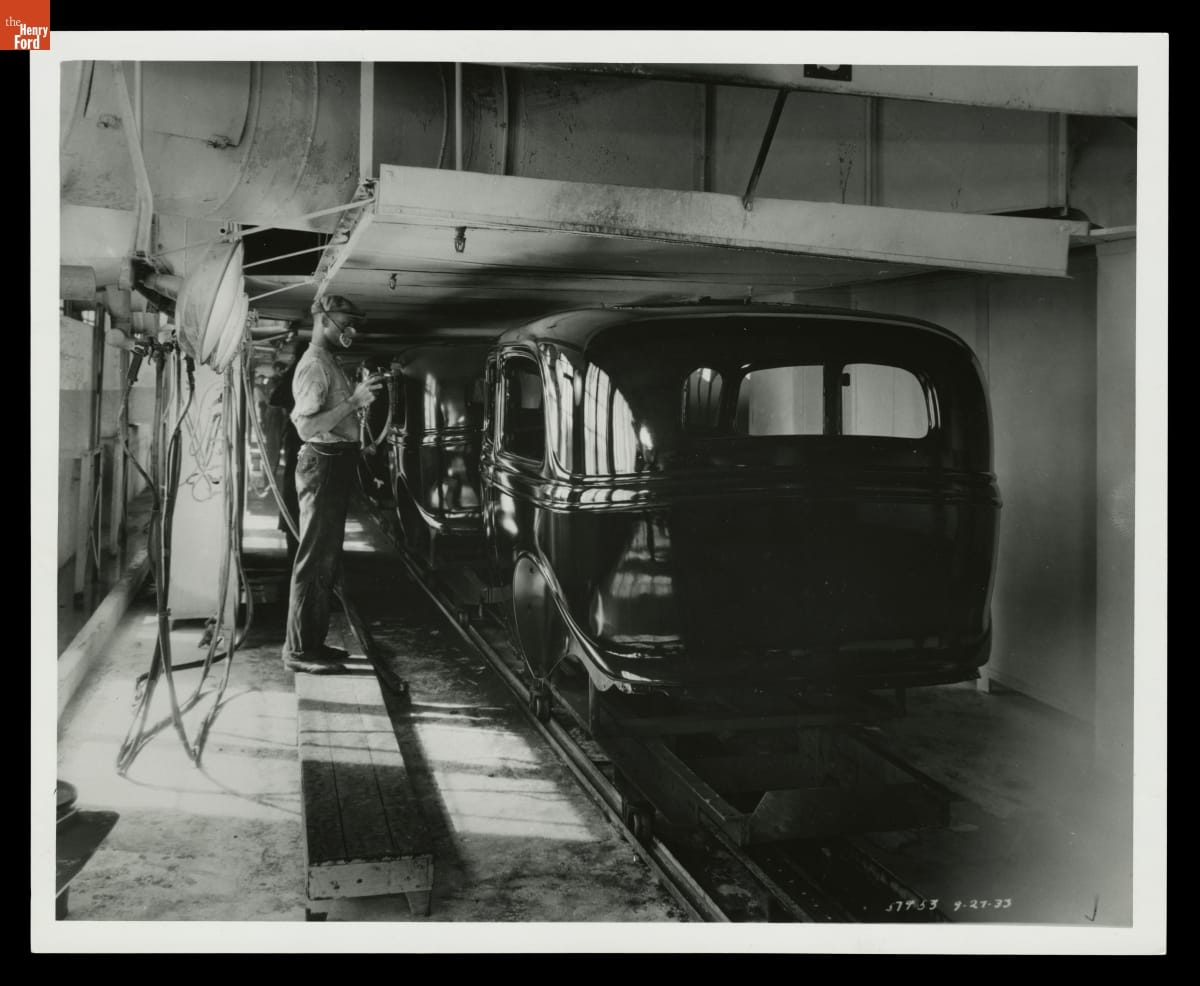 Spraying Lacquer on Ford Automobile Bodies at Briggs Manufacturing Company, Detroit, Michigan, 1933