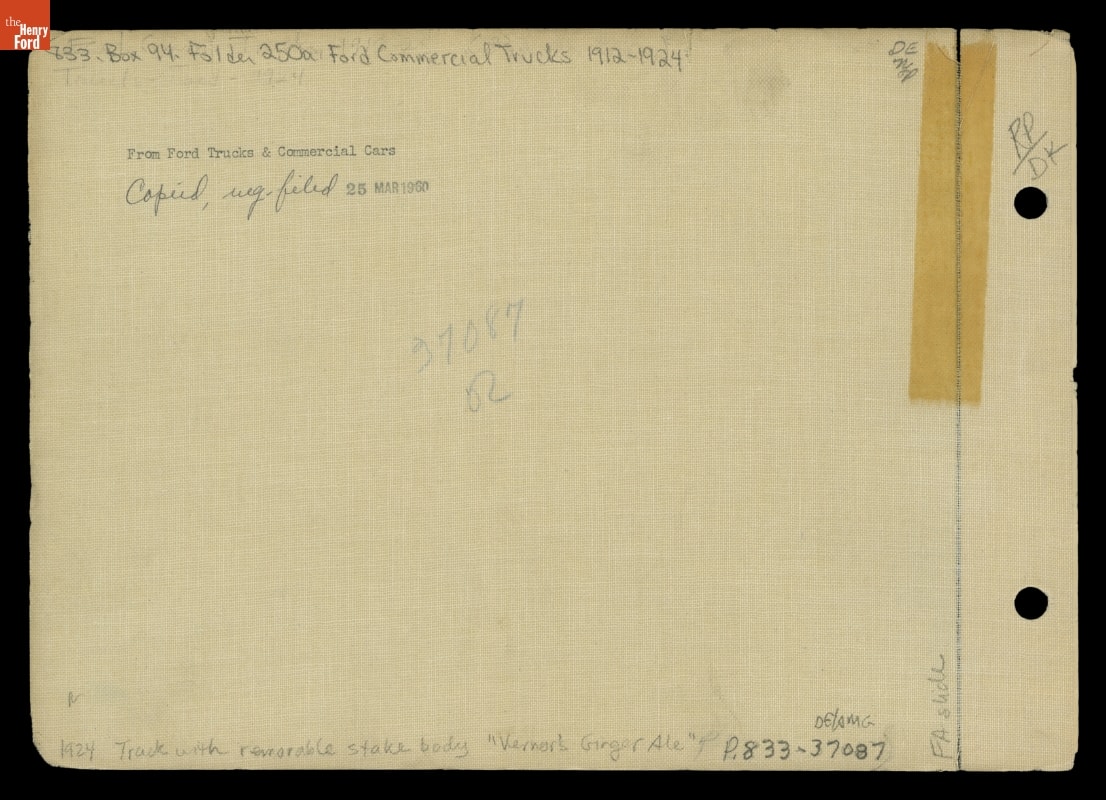 Vernor's Ginger Ale, one of the oldest surviving soft drinks in the United States, was created in Detroit. By the mid-1910s, innovations in bottling technology and the increasing affordability of the automobile allowed the company to begin delivery of the beverage. Vernor's Ginger Ale's first delivery fleet, purchased in 1916, included eight Ford Model T trucks. The company continued to use Ford vehicles for many years.