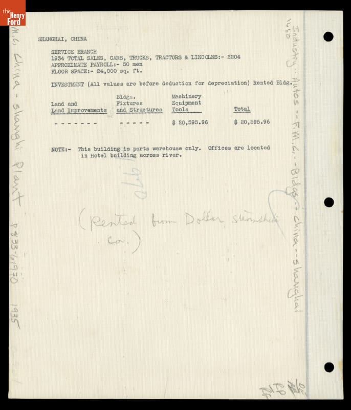 SHANGHAI, CHINA SERVICE BRANCH 1934 TOTAL SALES, CARS, TRUCKS, TRACTORS & LINCOLNS:- 2204; APPROXIMATE PAYROLL:- 50 men FLOOR SPACE:- 24,000 sq. ft./ . INVESTMENT (All values are before deduction for depreciation) Rented Bldg./ Land and Land Improvements _____ Bldgs. Fixtures and Structures _____ Machinery, Equipment, Tools, $ 20,595.96 Total $ 20,595.96 NOTE:- This building is parts warehouse only. Offices are located in Hotel building across river.