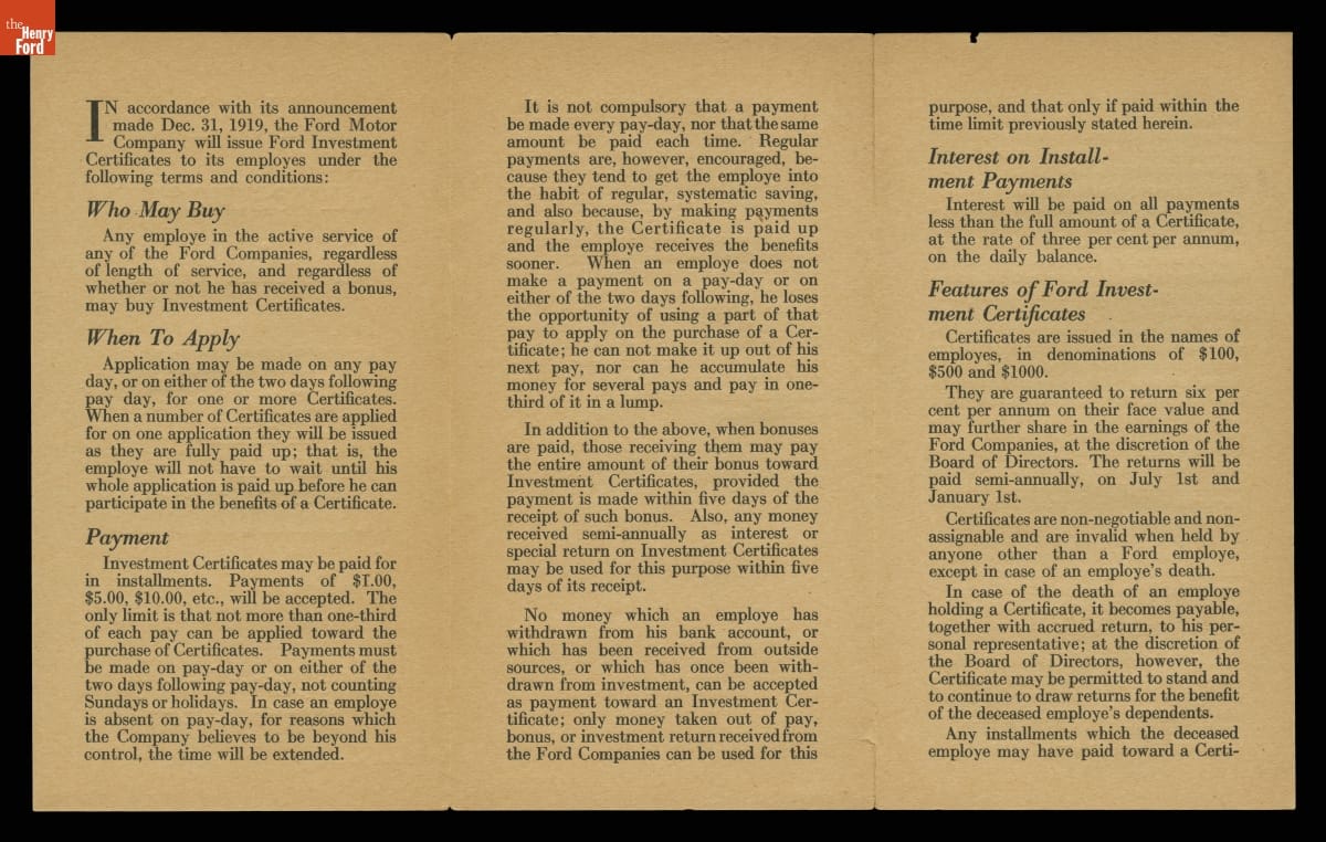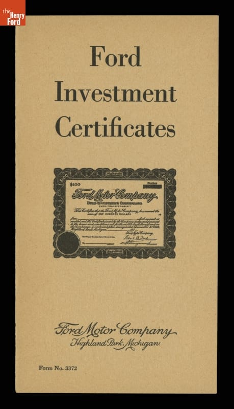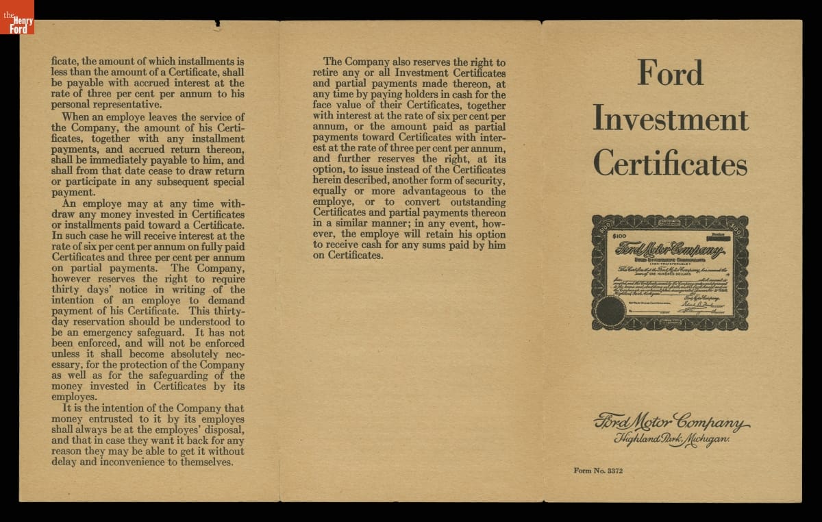 Ford Motor Company Employee Investment Certificates Brochure, 1920-1922