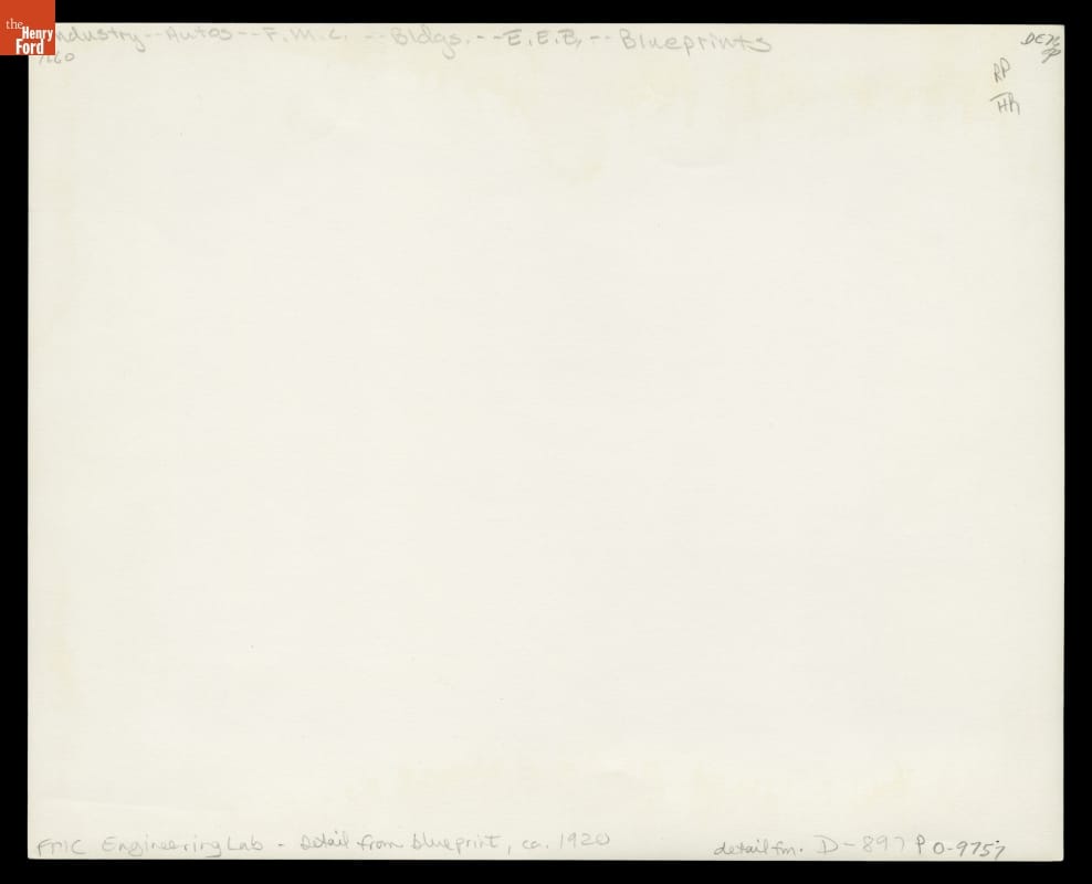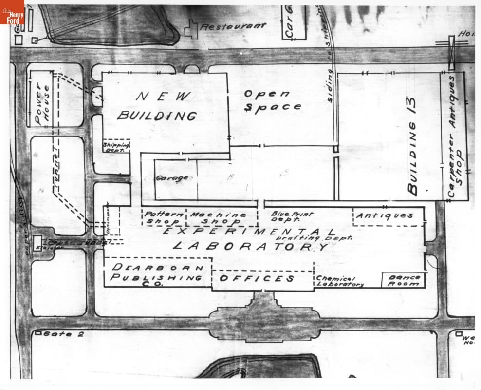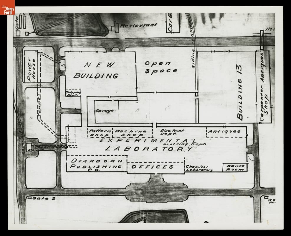 This floor plan of Ford Motor Company's recently completed engineering laboratory nicely illustrates Henry Ford's varied interests during the mid-1920s. Ford Motor Company facilities included executive offices, and a laboratory and workshops for product development. The publishing office, storage space for antiques, and dance room accommodated Henry Ford's personal interests. The industrialist often blurred the line between his business and personal activities.