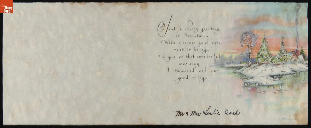 Mailing colorful, commercially designed greeting cards had become an American tradition by the 1920s and 1930s. Friends and neighbors commonly exchanged cards that wished one another a merry Christmas or happy New Year during the winter holidays. Publishers sometimes decorated these cards with nostalgic images of mills, churches, or covered bridges steeped in snow.