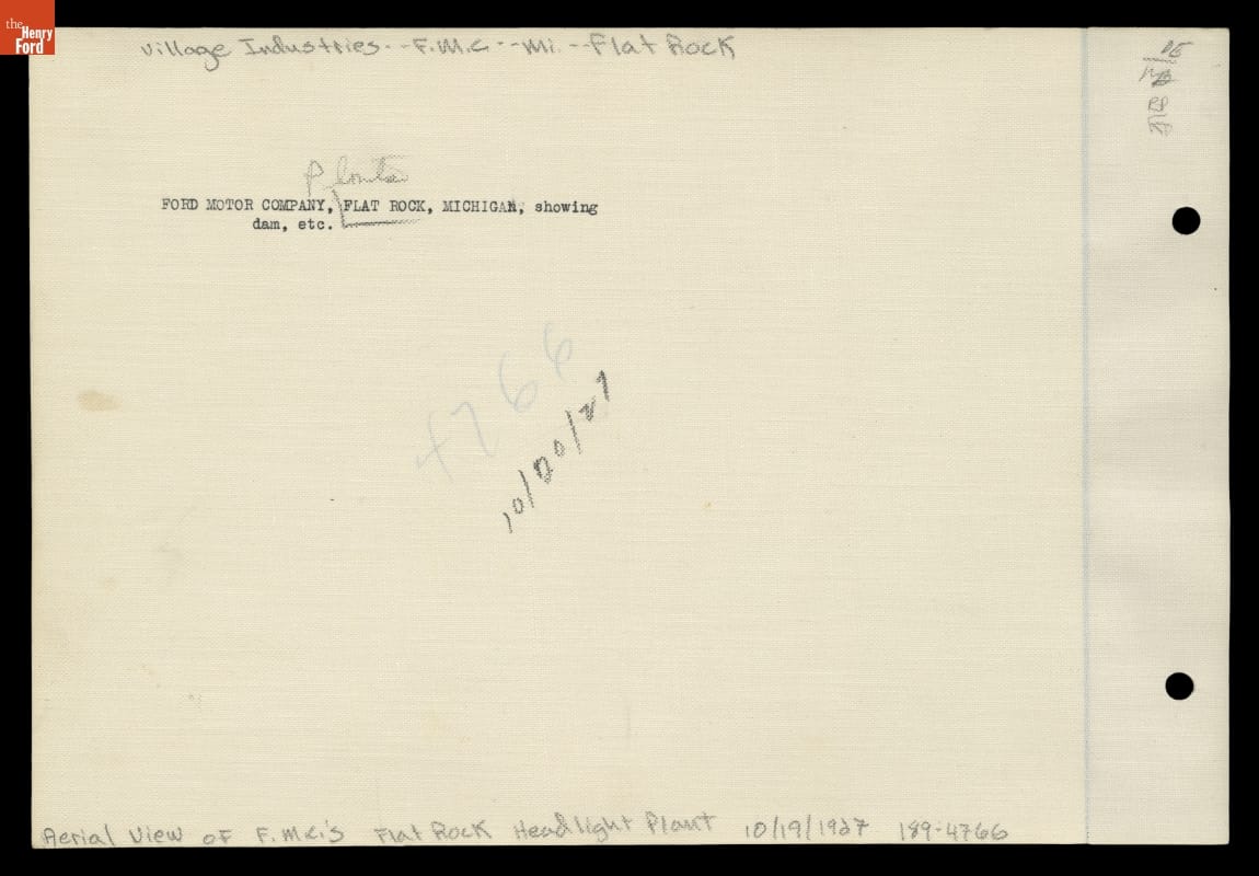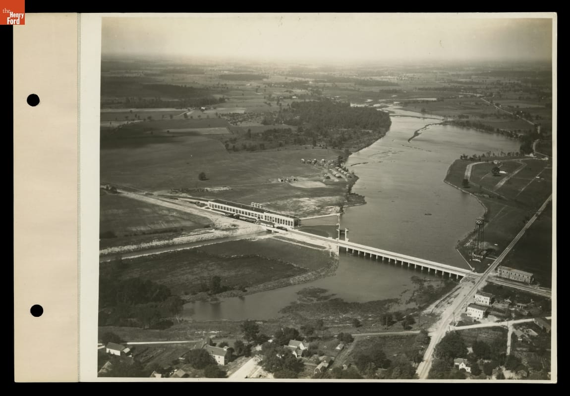 Ford Motor Company opened an automotive lamp factory on the Huron River at Flat Rock, Michigan, in 1923. Water-driven turbines supplied the plant's electricity. The nearby dam was next to a bridge that carried both a factory access road and the Detroit, Toledo & Ironton Railroad across the river. Ford ended production at the plant in 1950.