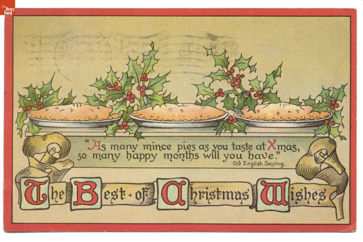 Mailing colorful, commercially designed greeting cards had become an American tradition by the early 20th century. During the holidays, friends and neighbors commonly exchanged cards wishing one another a Merry Christmas or Happy New Year. Publishers sometimes decorated these cards with feast imagery - such as mince pies or steaming dishes of meat - to evoke warm seasonal memories.