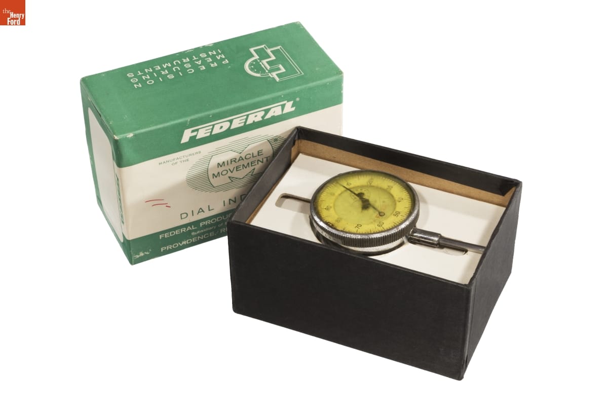 Dial indicators provide accurate measurements of parts used in a number of manufacturing processes. The large numbers on the indicator's face make small, imperceptible dimensions visible. Operators compare these measurements against a standard and make corrections if any deviation is found. The Federal Products Corporation made a variety of precise measuring devices in the 20th century.