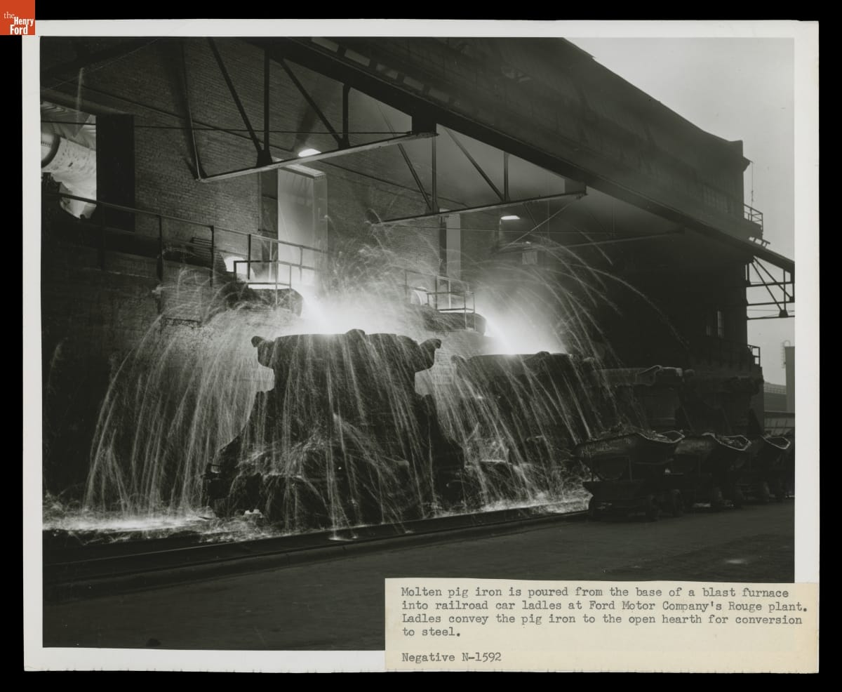 Three blast furnaces at Ford Motor Company's Rouge plant converted raw iron oxide ore into metallic iron. The molten iron was then poured into special railroad car ladles for transport to open-hearth furnaces, where the iron was further processed into steel. Together, the three blast furnaces could produce 6,700 tons of metallic iron every 24 hours.