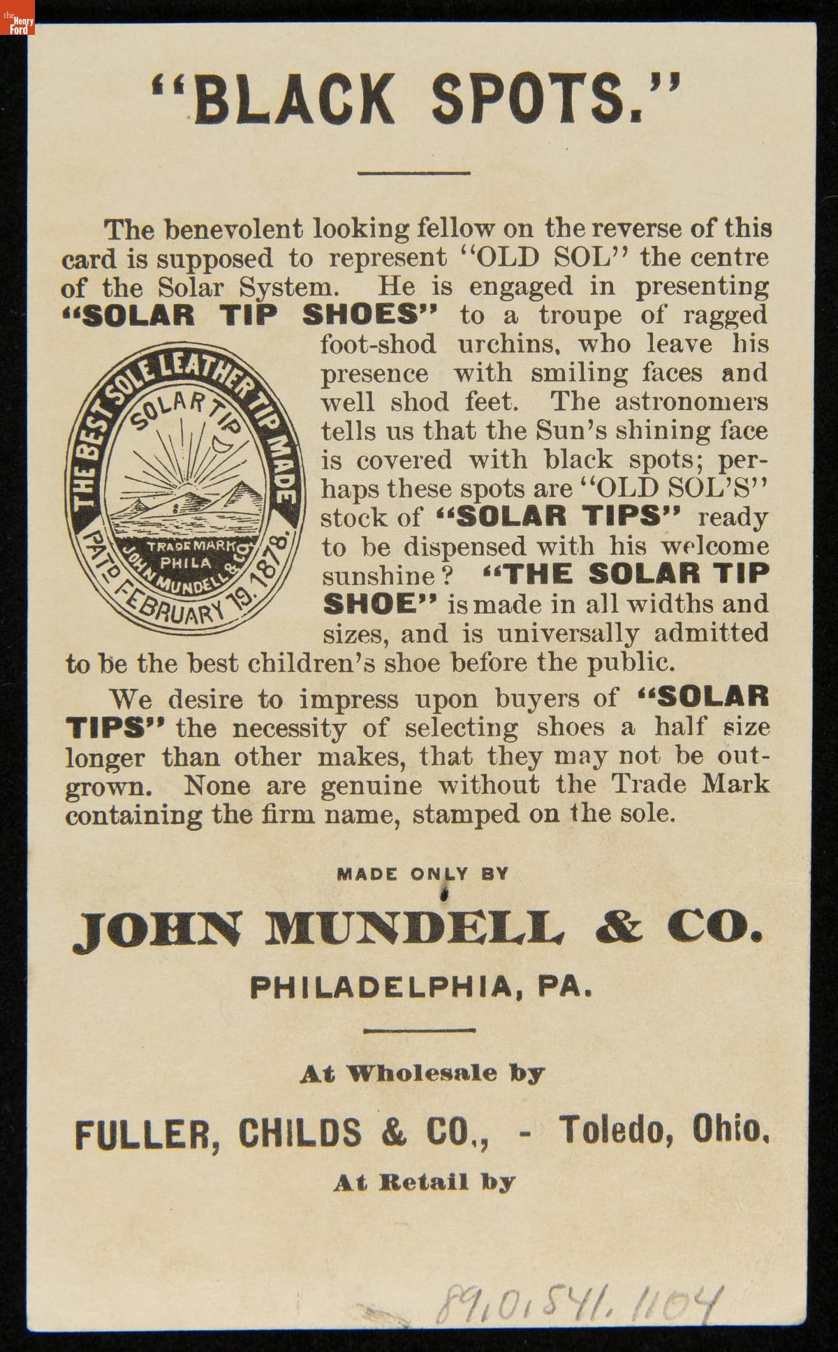 As color printing gained momentum in the late 19th century, trade cards became a major means of advertising goods and services. Americans enjoyed and often saved the little advertisements found in product packages or distributed by local merchants. This trade card advertises Solar Tip Shoes sold by John Mundell & Company.
