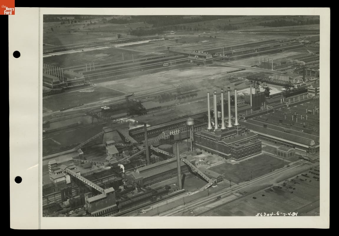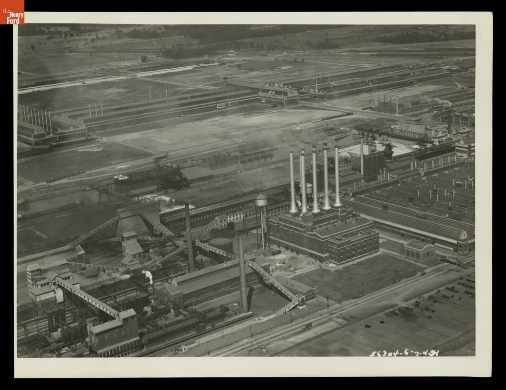 This aerial view shows Ford Motor Company's sprawling Rouge plant--the largest, most efficient manufacturing complex of its time. Ford established its administrative headquarters here in 1928, around the same time the company began manufacturing automobiles from start to finish at the plant. The Rouge became not only central to Ford's operation but an icon of modern industrial efficiency.