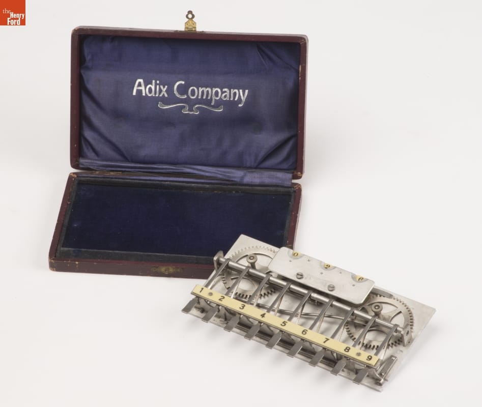 The Adix adding machine provided fast, accurate calculations for single-column sums. Josef Pallweber patented the machine in 1903, and in 1904, the newly formed Adix Company began production of this small, convenient device with its exposed system of gears. Adix adding machines would remain in production for the next 26 years.