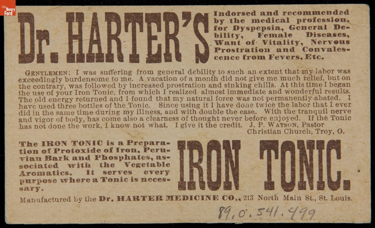 Trade Card for Dr. Harter's Iron Tonic, 1875-1890
