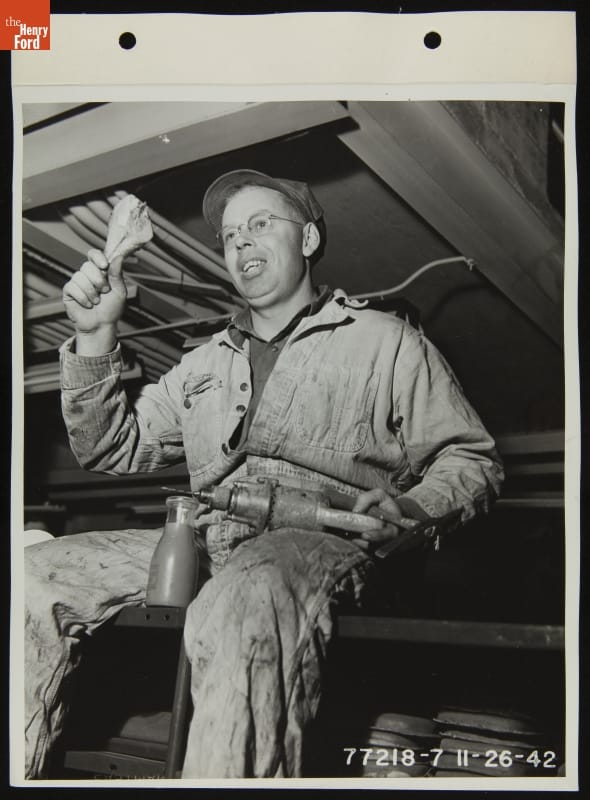Ford Employee Harry Finn Eating Thanksgiving Dinner on the Job at the Highland Park Plant, November 1942