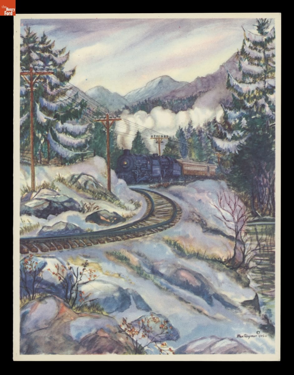 Railroads found a place in American traditions surrounding the holiday season. Trains became synonymous with trips to visit loved ones, and electric train sets became staples under the Christmas tree as decorations and gifts. More recently, movies like The Polar Express reinforced the connection. This holiday greeting card embraced the longstanding ties between yuletide and railroading.