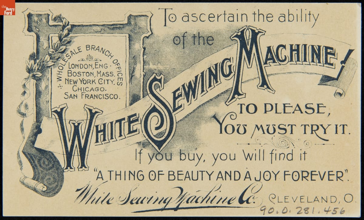 Manufactured by White Sewing Machine Company, Cleveland, Ohio. Lithographed by Knapp Litho. Company, New York, New York.