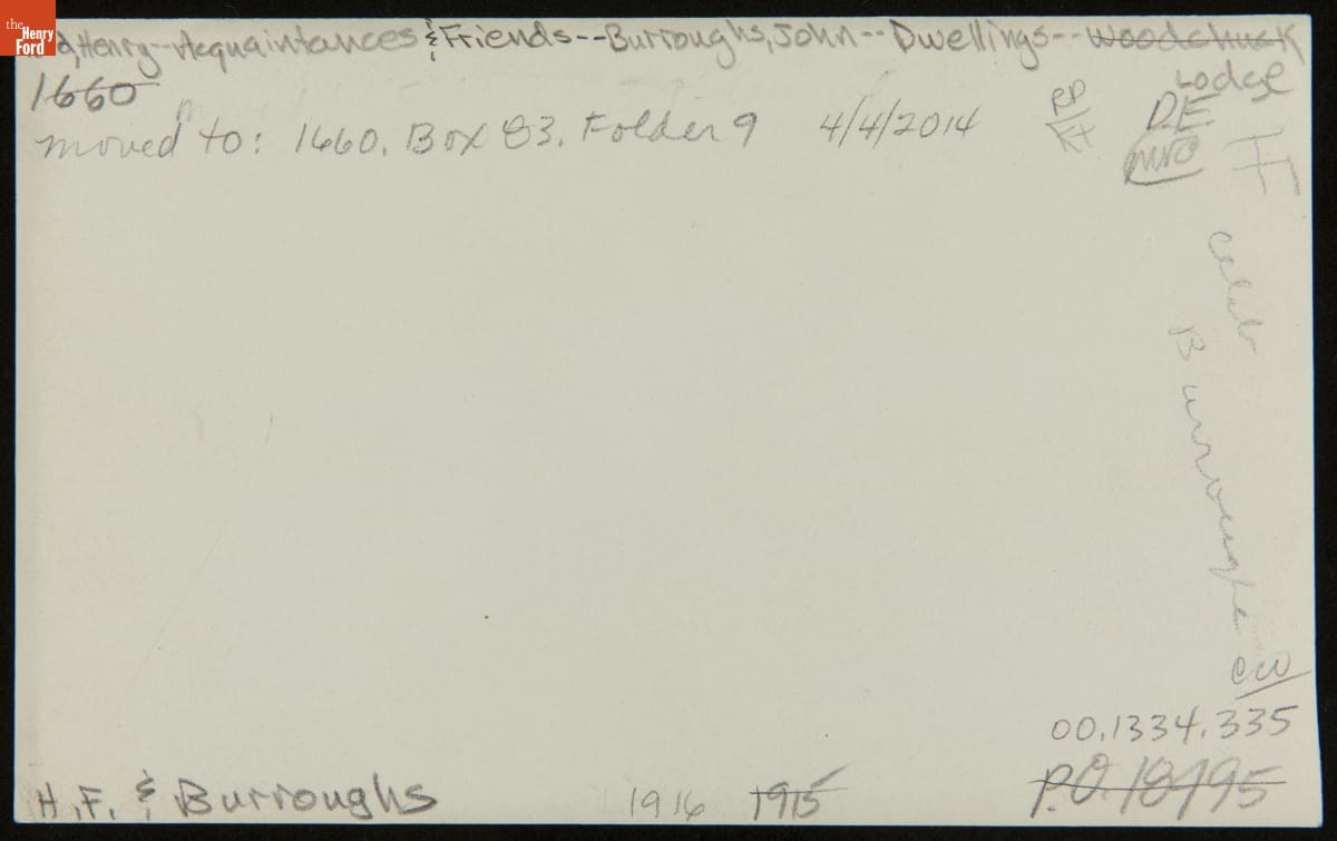 In the early 1910s, Henry Ford befriended John Burroughs, an internationally known naturalist and writer. The two bonded over their love of birds and nature. In 1916, Burroughs traveled to Dearborn, Michigan, to visit Ford at his home -- Fair Lane. This photo shows the pair near the Sugar House on the 1300-acre estate.