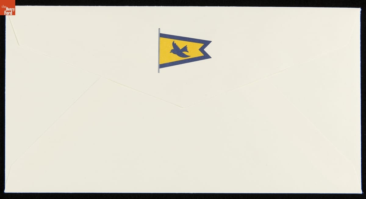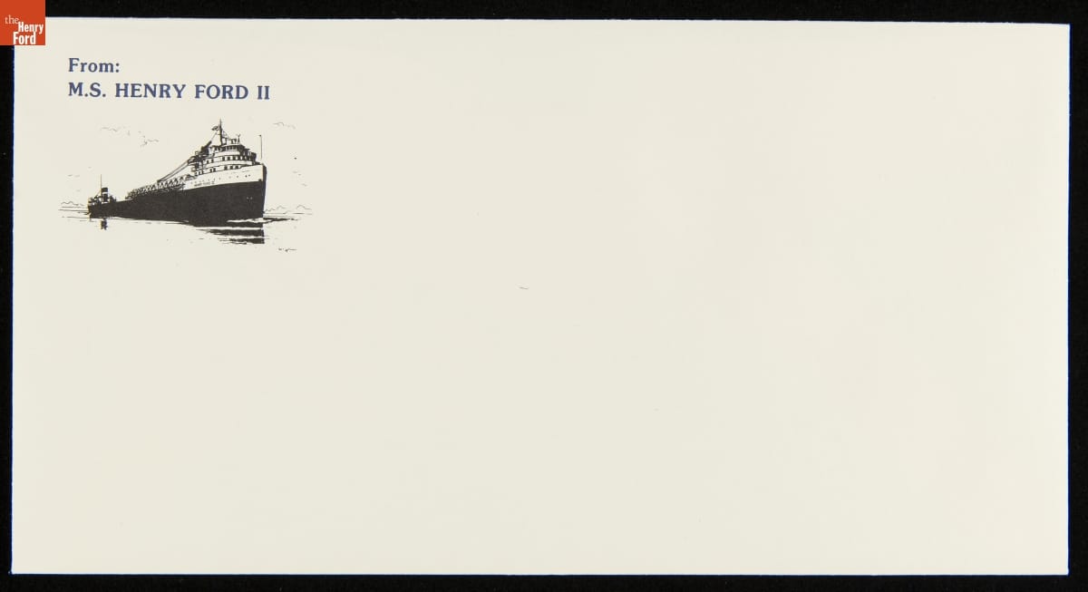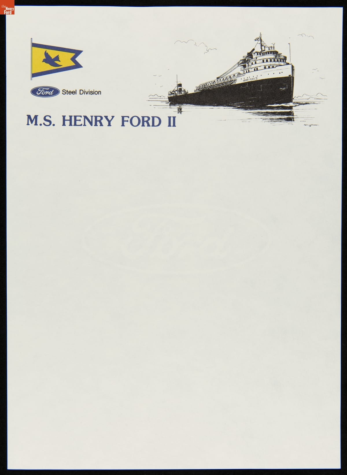Stationery for the Ford Motor Company's ore carrier Henry Ford II contains images of the freighter, the Ford logo, and the house flag flown when the ship was underway. The flag depicts a bluebird -- a favorite of Henry Ford, an amateur birdwatcher. The ship hauled raw material to Ford's River Rouge factory near Detroit, Michigan, for more than 60 years.