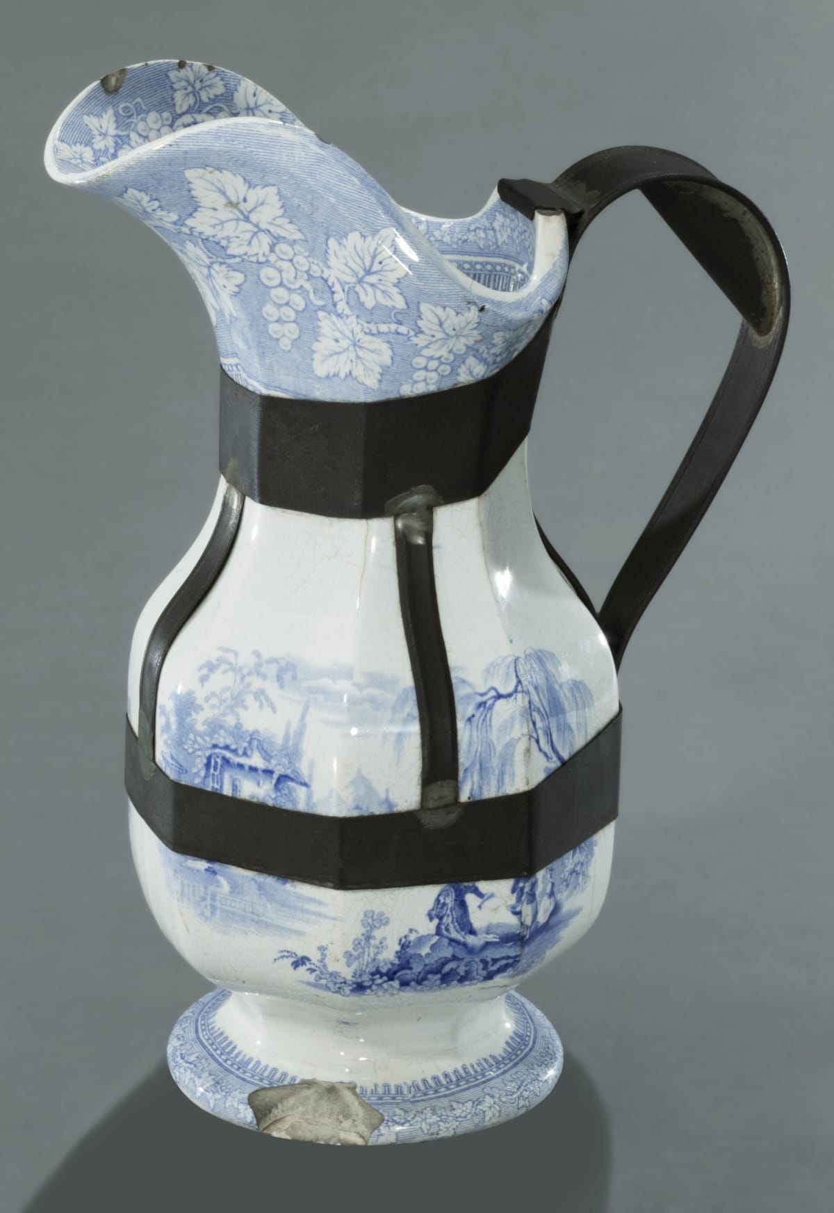 In the 19th century, when a useful piece of serving ware like a ceramic pitcher broke, it was common to send it to the local tinsmith who would create a structure or mount to keep the pitcher usable.