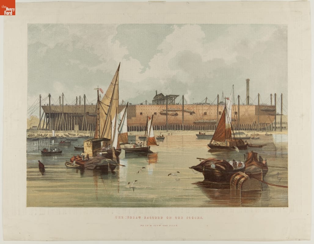 Chromolithograph, "The Great Eastern on the Stocks as Seen From the River," 1857