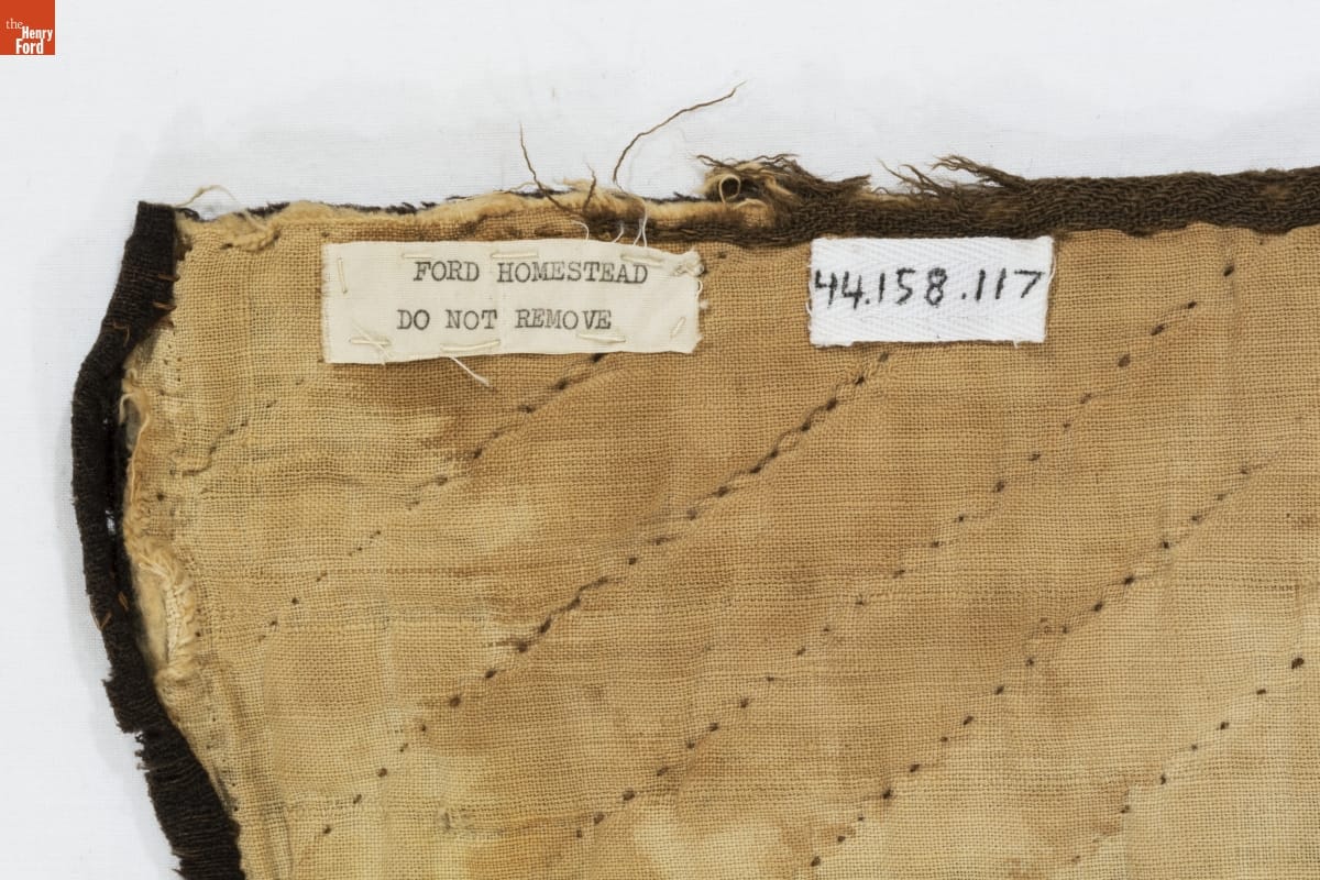This quilt is made from linsey, a handwoven wool fabric with a cotton warp. During the Civil War, when the Union blockade created critical shortages of cloth, southerners wove linsey to help satisfy the need for clothing and bedding for civilians and soldiers. After the war, when factory-made cloth again became available, resourceful southern women used discarded linsey clothing and blankets to make warm quilts.