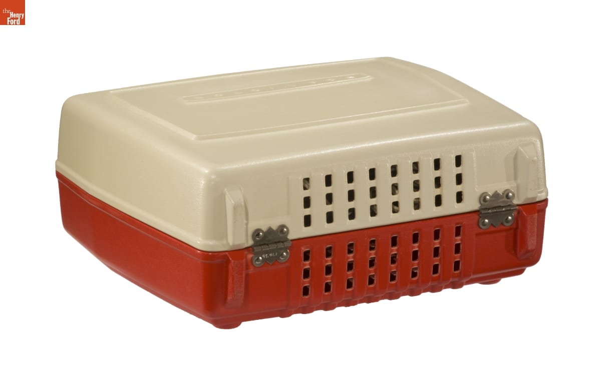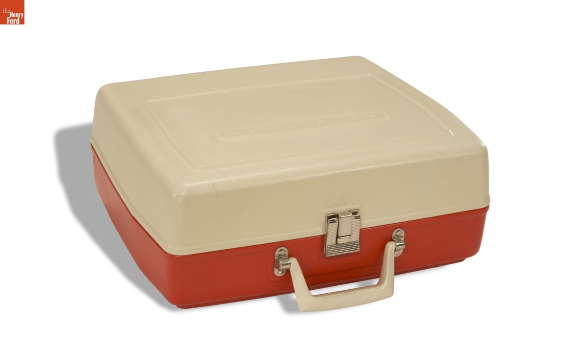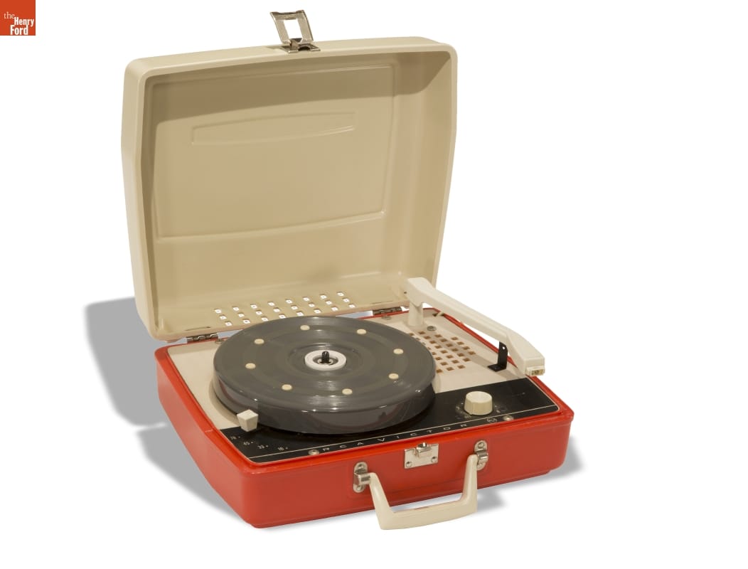 With its small footprint, playful plastic case, and carrying handle, this record player emphasizes fun and convenience over high sound quality. It was easy to use: listeners only needed to select the record speed (45 or 33 1/3 rpm) and adjust the volume. The target demographic was young listeners, to help create an atmosphere for social times on the go.