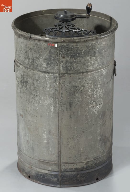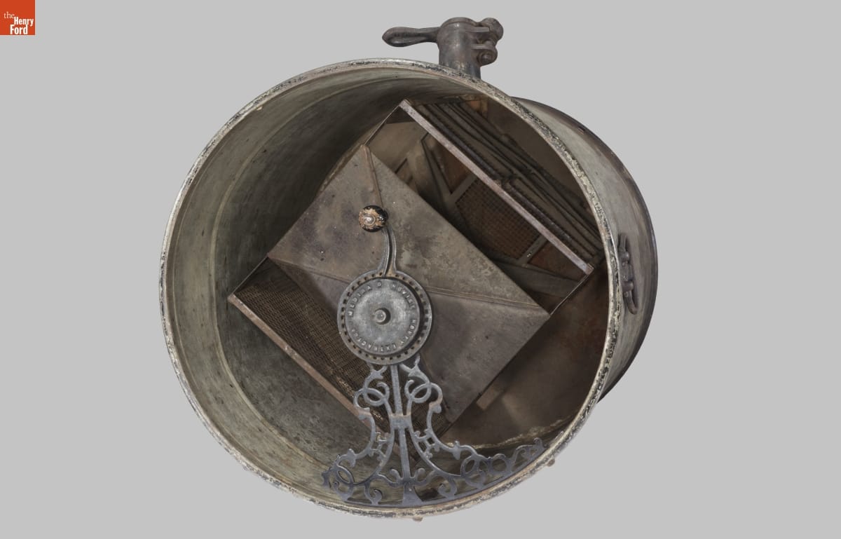 A swarm of bees captured Amos Root's attention in 1869. He began publishing Gleanings in Bee Culture in 1873 and included testimonials about his "Novice extractor." Root improved the extractor over 25 years, and by 1898, beekeepers used this galvanized metal version, advertised as stronger and more durable than earlier versions, to separate honey from comb to satisfy a growing number of honey consumers.