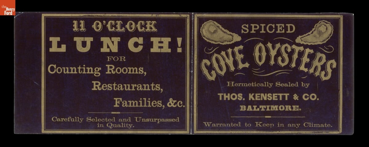 Text on label reads: SPICED \ COVE OYSTERS \ Hermetically Sealed by \ THOS. KENSETT & CO. \ BALTIMORE \ Warranted to Keep in any Climate \ 11 O'CLOCK \ LUNCH! \ FOR \ Counting Rooms, \ Restaurants, \ Families, &c. \ Carefully Selected and Unsurpassed \ in Quality