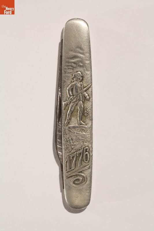 The first official World's Fair held in the United States celebrated the 100th anniversary of the signing of the Declaration of Independence. Around ten million people visited Philadelphia during the Centennial International Exhibition of 1876. Many returned home with mementos of the exposition, such as this pocket knife depicting a soldier of the American Revolution.