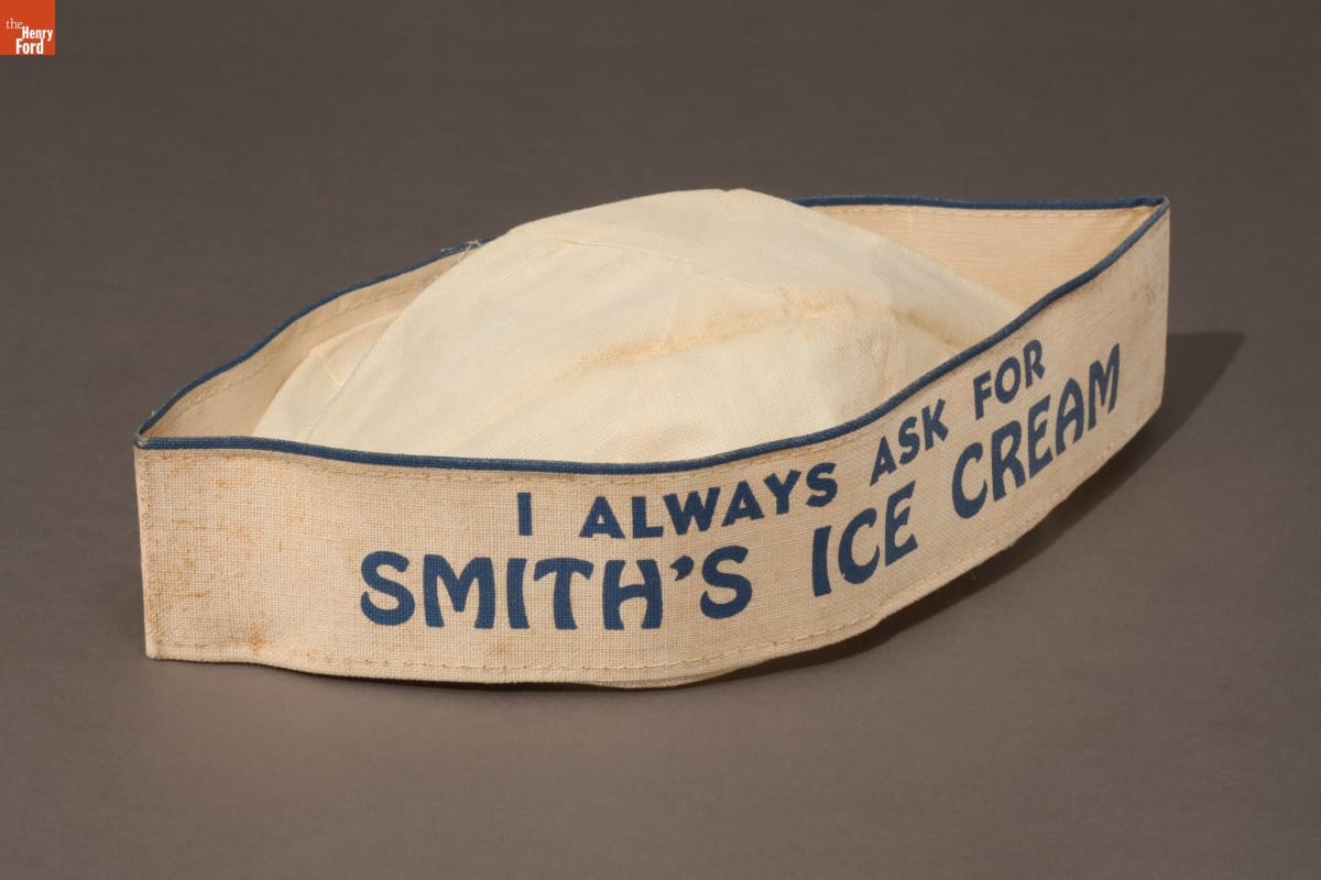 A soda fountain sold drinks, ice cream, candy and simply prepared foods. Behind the counter a "soda jerk" made drinks, dipped ice cream, and dispensed food. A soda jerk usually wore this type of cap. The advertisement on the cap promoted the soda fountain's fare, in this case, Smith's Ice Cream.