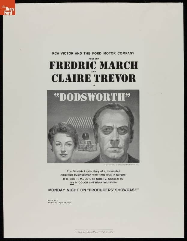 The Ford Motor Company and RCA sponsored the award-winning anthology series Producers' Showcase. The NBC series ran for 37 episodes from 1954 to 1957. This advertisement, slated for TV Guide, promoted the show's treatment of Dodsworth, a television adaptation of the 1934 play based on the Sinclair Lewis novel. Claire Trevor would win an Emmy for her performance.