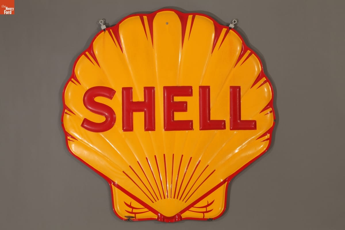 In 1904, the Shell Transport and Trading Company (later Shell Oil) adopted the scallop shell as its trademark. Over time, different iterations of the scallop shell corporate logo were developed. By the mid-20th century, it had been stylized, with the bright bold yellow-and-red color scheme that it has today -- beckoning motorists off the highway in the face of steep competition.