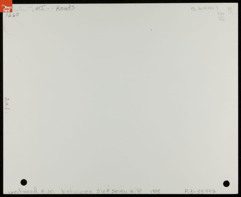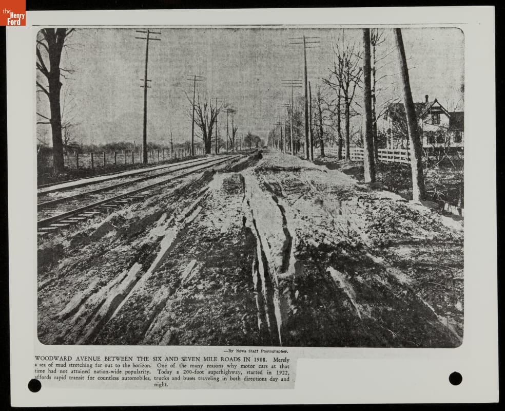 Woodward Avenue between Six and Seven Mile Roads in Wayne County, Michigan, was paved in 1909, creating the country's first mile of concrete highway. This copy of a newspaper clipping shows the road's poor condition before paving. Soon, new road construction technologies improved roadways throughout the United States.