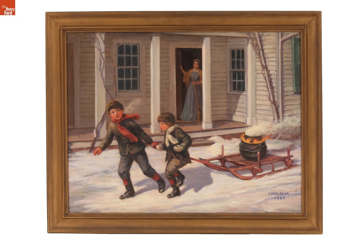 Henry Ford and his younger brother, John, pull a sled holding a kettle of boiling water while their mother, Mary, watches from the doorway. The boys are playing train, pretending that the sled is a thundering steam locomotive. This painting is one of several childhood scenes that Henry Ford commissioned from his favorite artist, Irving Bacon.