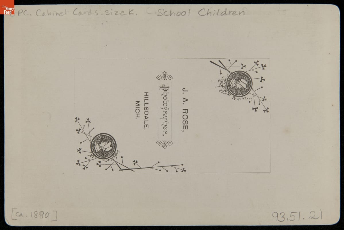 This cabinet card shows three teachers and 44 students posing outdoors, perhaps outside the school. This was not a one-room school; the students are approximately the same age. Hillsdale, Michigan, a busy railroad town, had a graded school system. The boys wear shirts, suspenders, and jackets; girls wear pinafores or aprons over their dresses. The teachers wear high-necked, long-sleeve dresses with aprons.