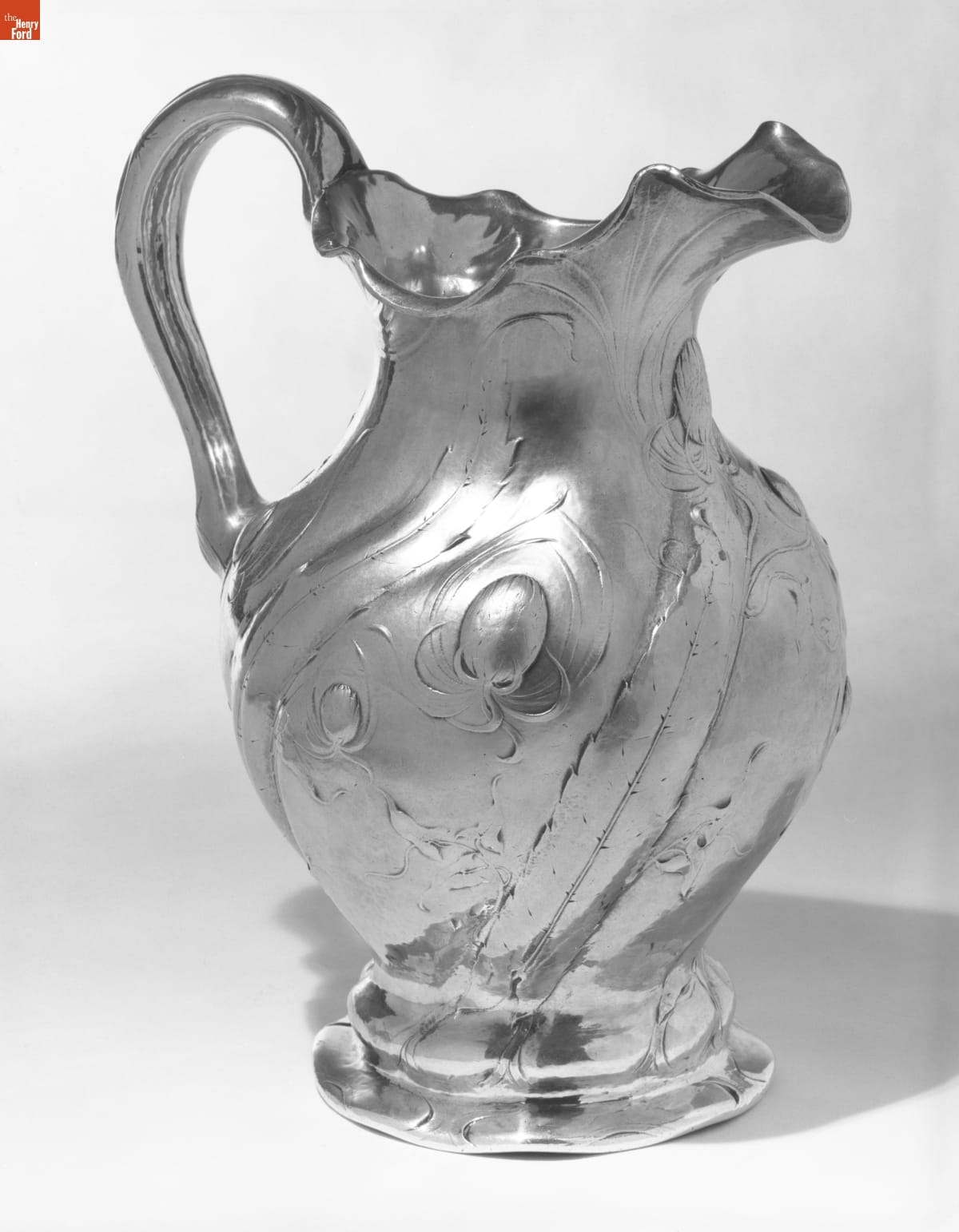 Inspired by the Parisian gallery that gave the Art Nouveau style its name, designers at the Gorham Manufacturing Company in Providence, Rhode Island, developed the "Martele" line of high-end silver in the late 1890s. This pitcher's asymmetry, fluid lines, and botanical motifs were characteristic of European Art Nouveau.