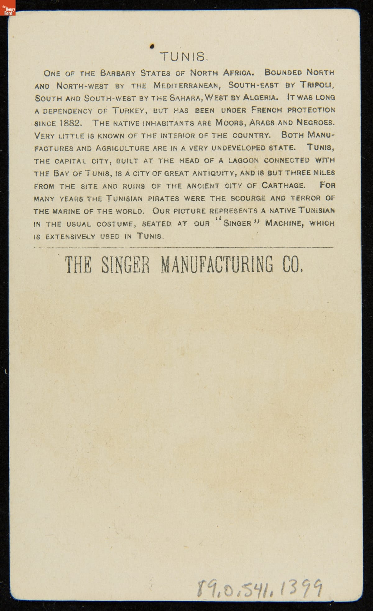 As color printing gained momentum in the late 19th century, trade cards became a major means of advertising goods and services. Americans enjoyed and often saved the vibrant little advertisements found in product packages or distributed by local merchants. The Singer Sewing Machine Company had a series of trade cards, like this one, offering images of Singer machine users from around the world in their national dress.
