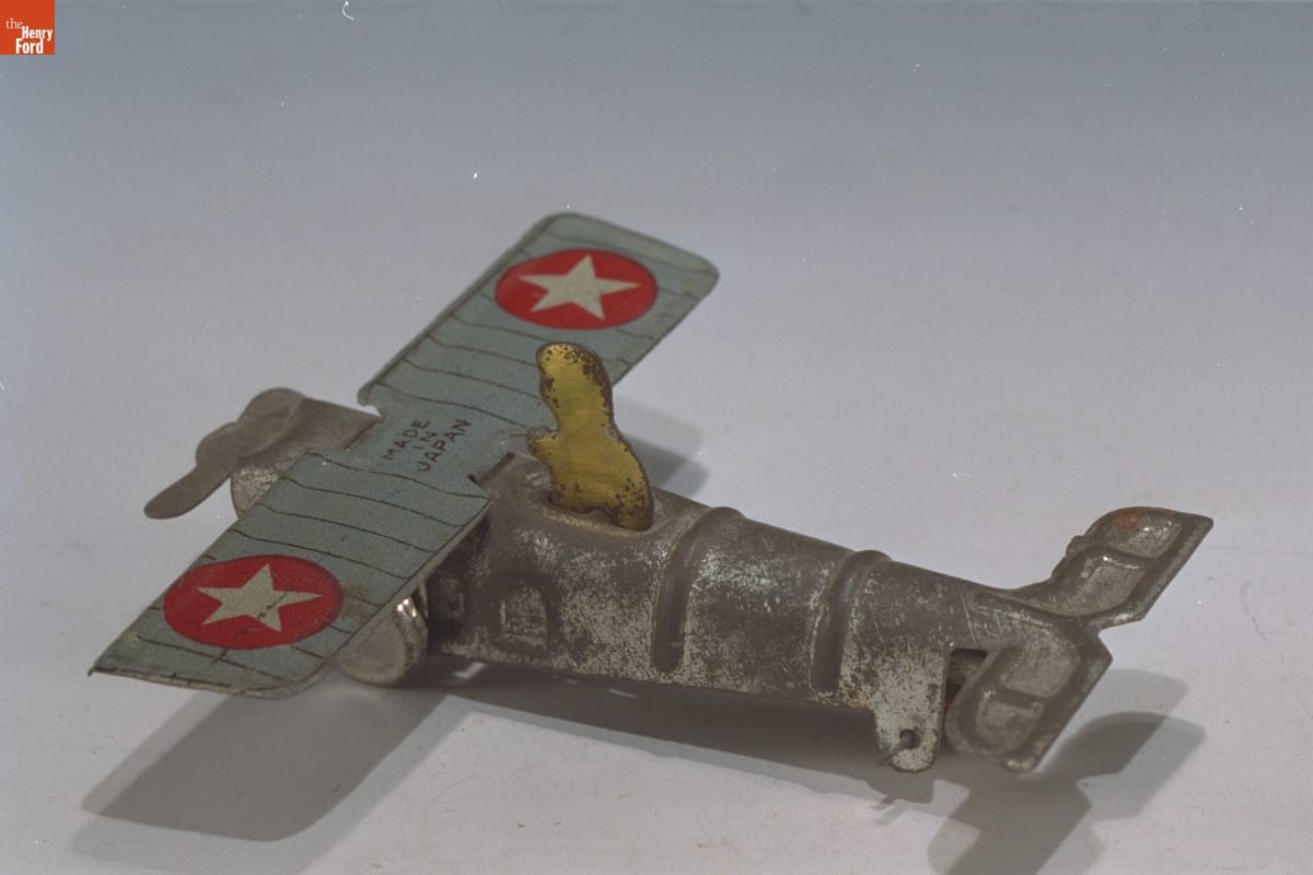 Toy companies began making small, inexpensive, yet colorful, tin toys in the late 19th century. Over the years, toymakers stamped tin into shapes of animals, trains, boats, soldiers and even this airplane. Children could purchase these low-priced toys from shopkeepers or street vendors. These mass-produced toys -- though not meant to last -- provided fun for just a few pennies.