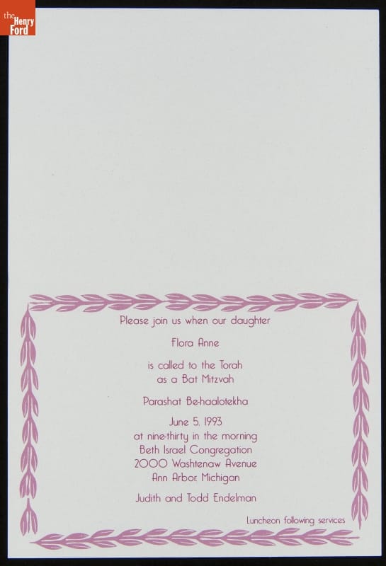 THF289735 / Invitation to the Bat Mitzvah of Flora Endelman, June 1993