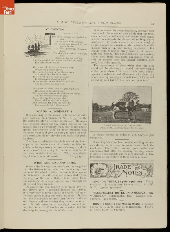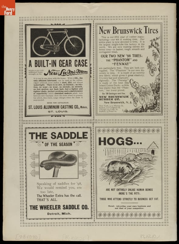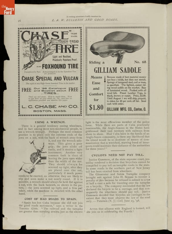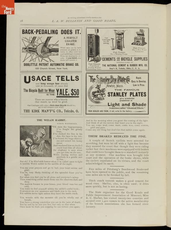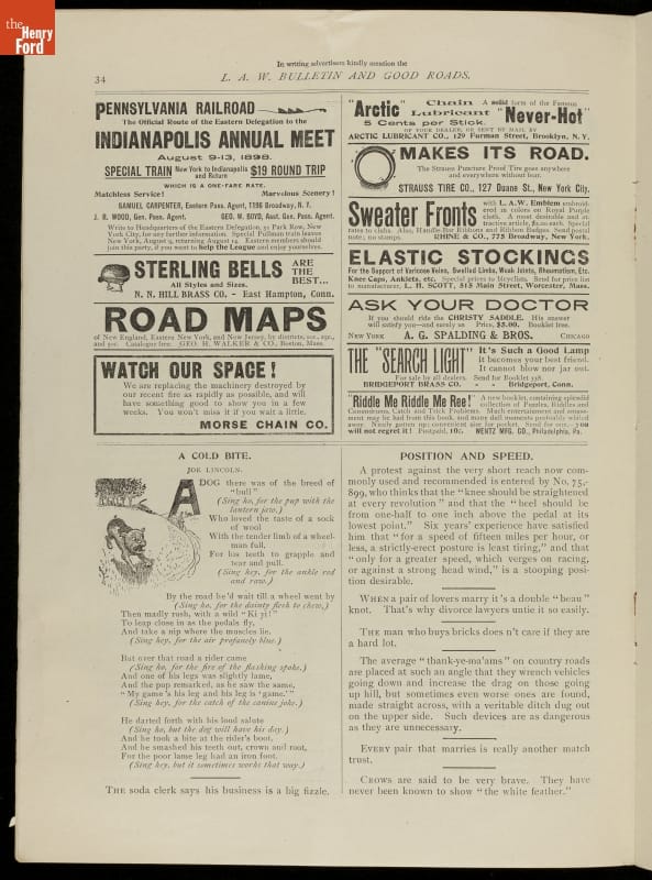 The League of American Wheelmen produced a weekly journal to promote good roads, and to highlight other issues of interest to American cyclists. This typical issue, from July 1898, contained news about the organization and its members. The journal also provided tour and safety information, poems, snapshots, and a host of bicycle advertisements for readers to enjoy.