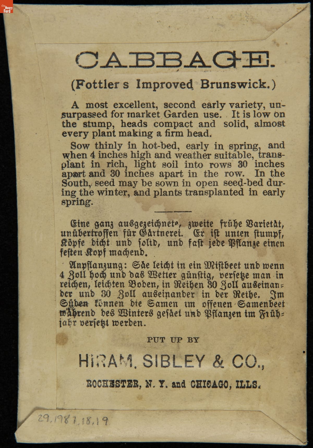 Distributing seeds required sealing them into little packets or "papers" constructed like envelopes. Seed companies advertised their businesses on these packets, illustrated the vegetable with hand-colored images, and specified growing directions, sometimes in multiple languages. Hiram Sibley and Co. packaged collections of vegetable seeds in specially designed boxes and shipped them to general stores for sale to home gardeners.