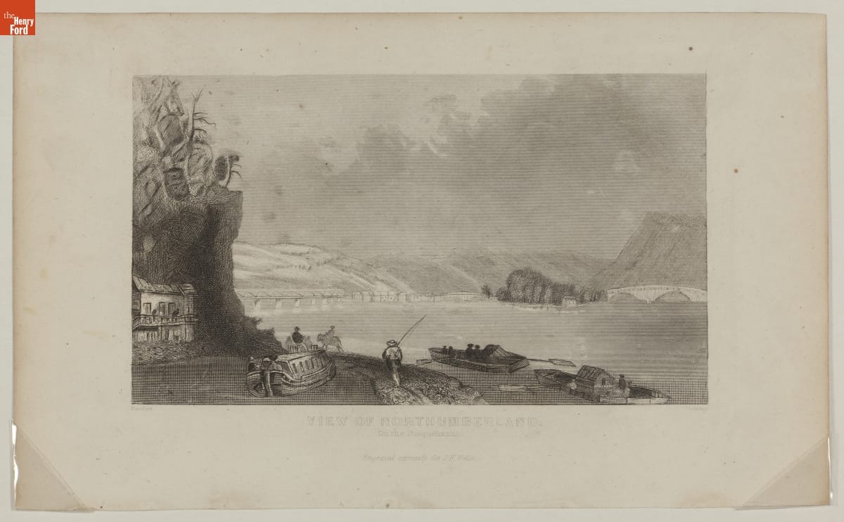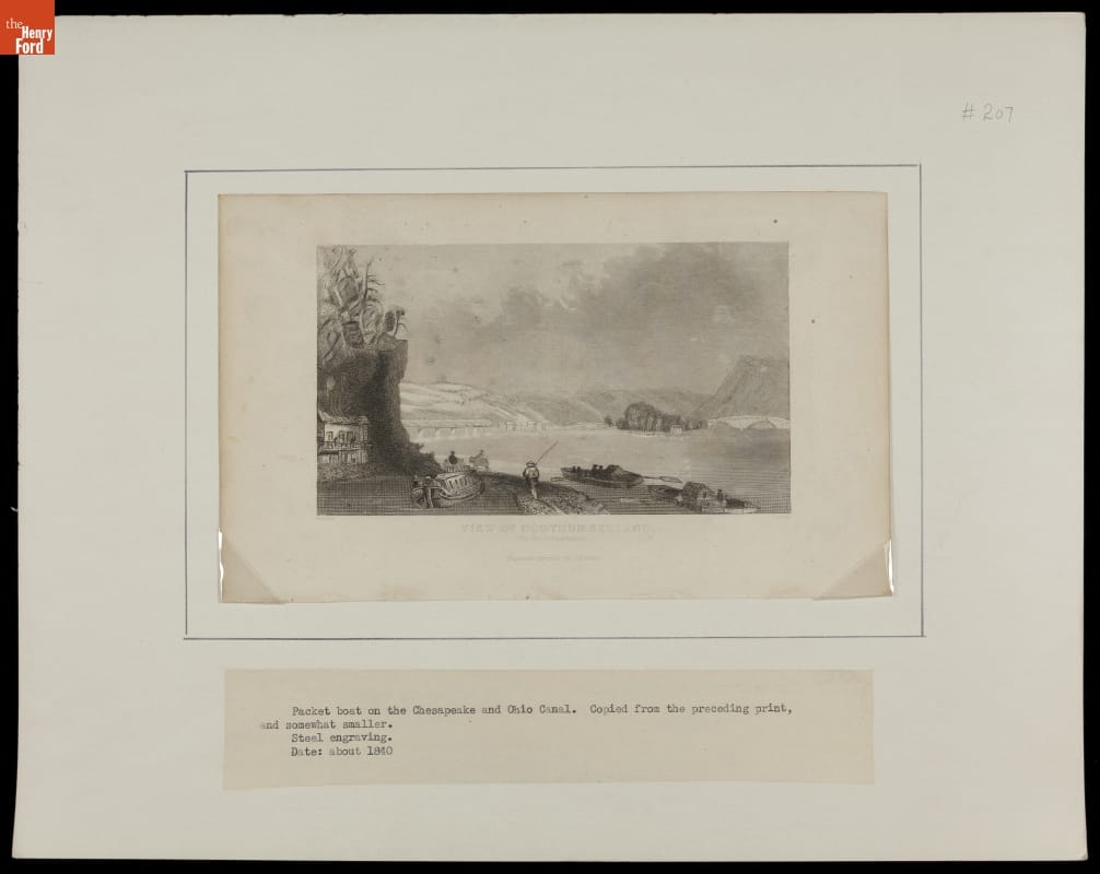 The first half of the 19th century was the heyday of canal construction in the United States. The Susquehanna Division of the Pennsylvania Canal [incorrectly identified in the later typewritten caption], which opened in 1831, connected the North and West Branches of the canal at Northumberland. This engraving illustrates a packet boat using the canal, with two flatboats floating nearby on the river.