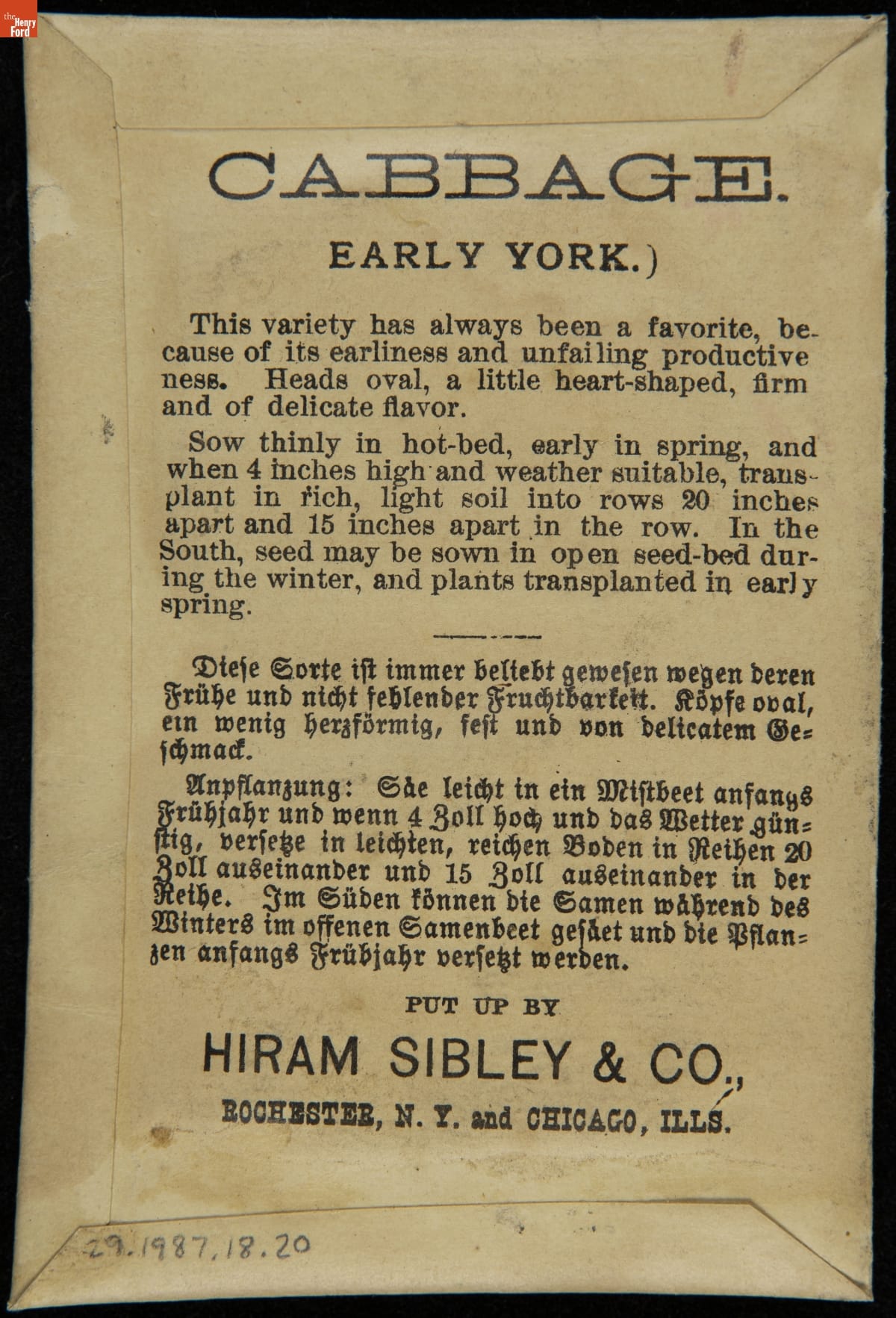on front: CABBAGE / EARLY YORK / SEND FOR OUR ILLUSTRATED CATALOGUE... / HIRAM SIBLEY & CO. / ROCHESTER, N.Y. & CHICAGO, ILL.