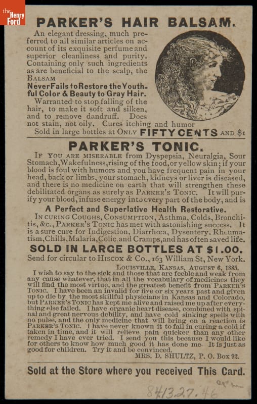 Trade Card for Parker's Tonic and Hair Balsam, Hiscox & Co., circa 1885