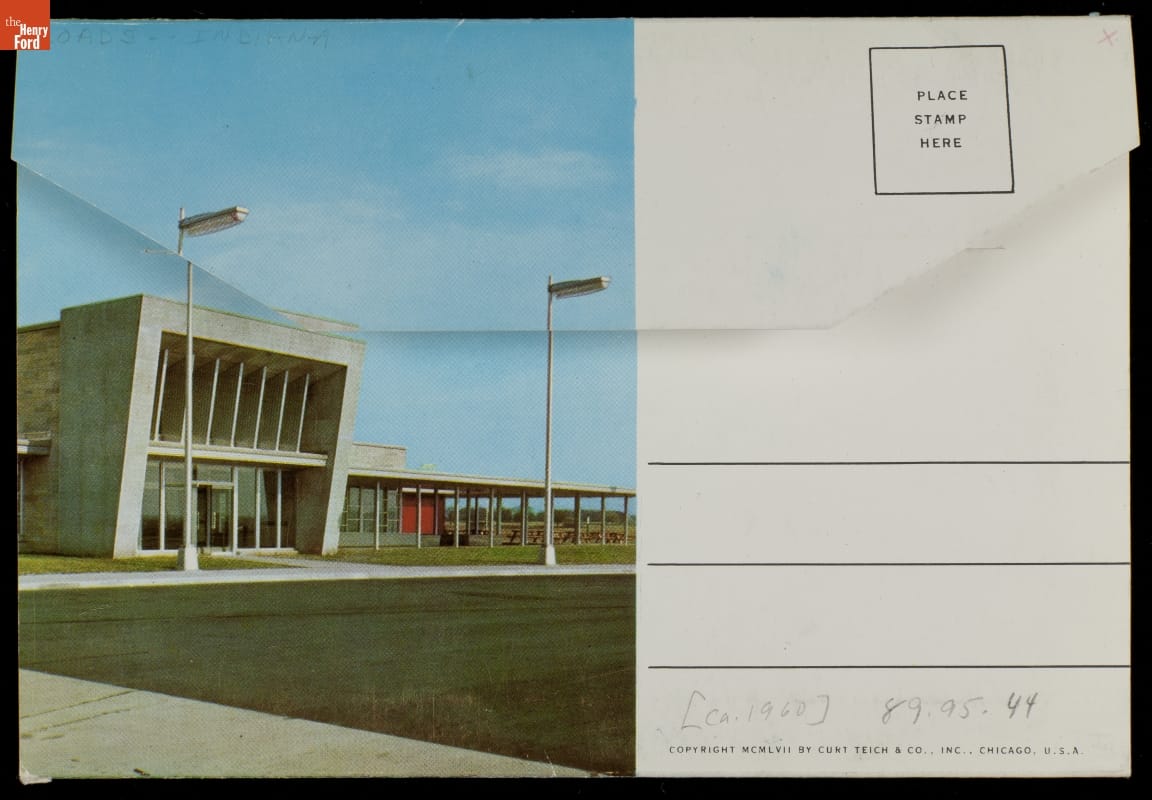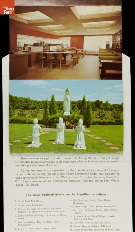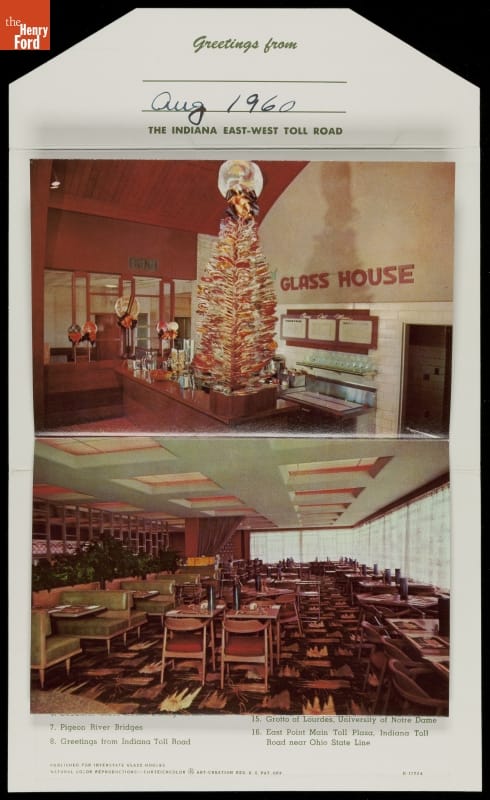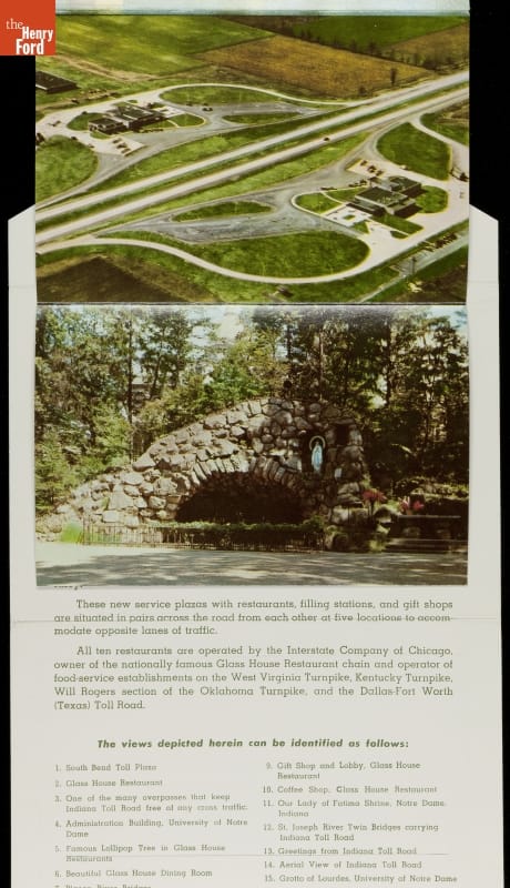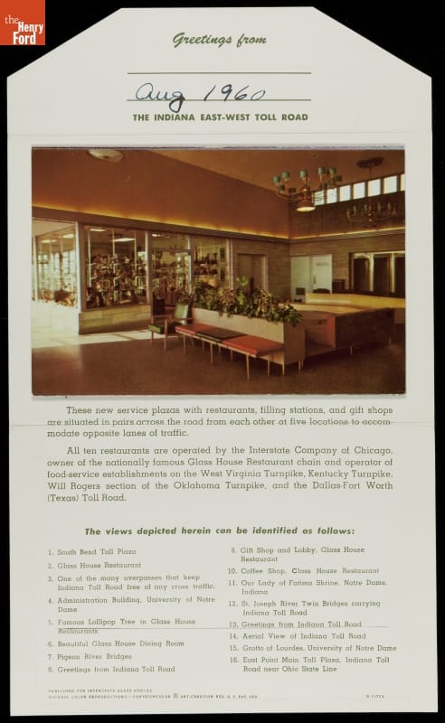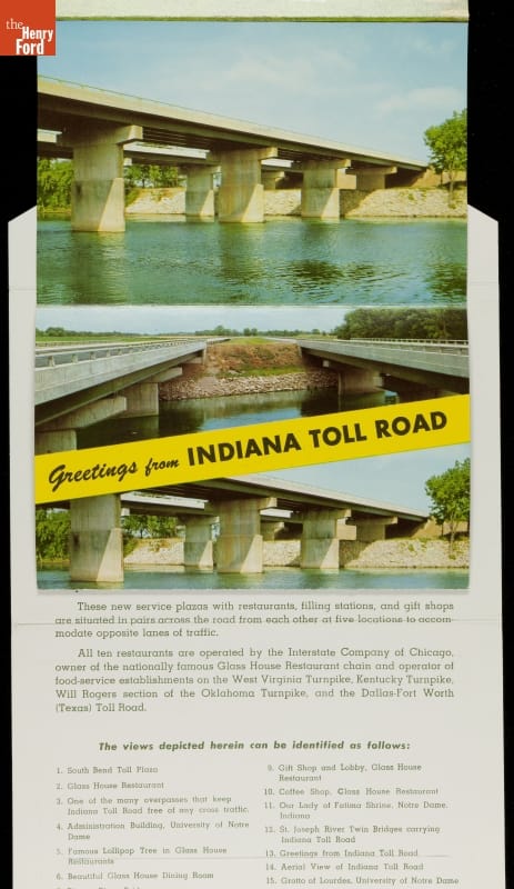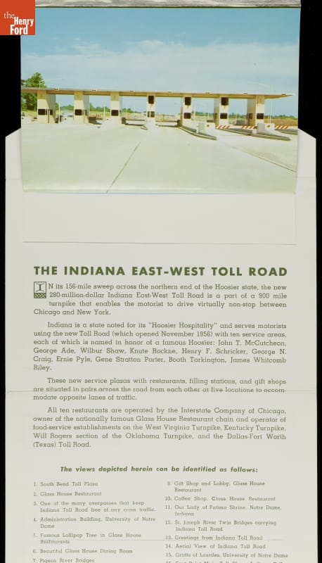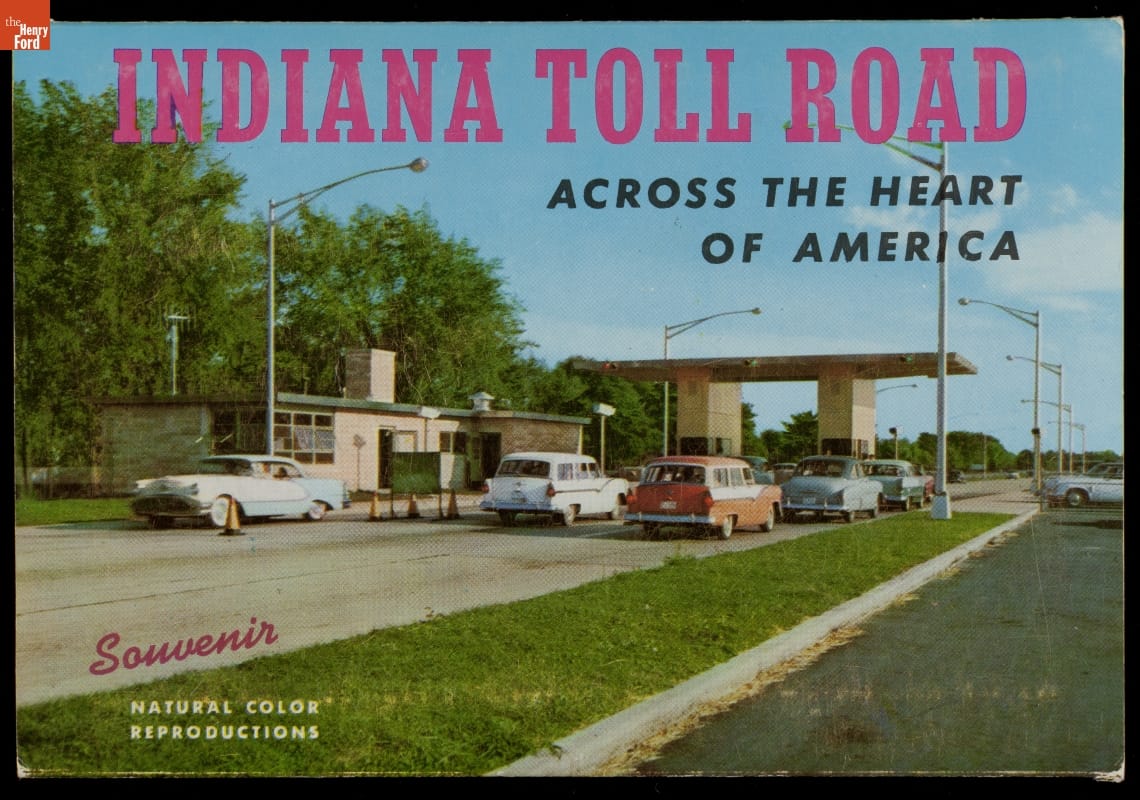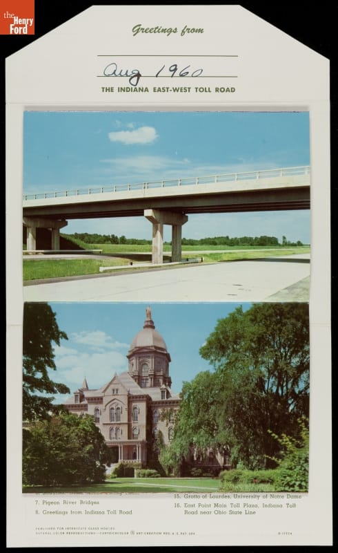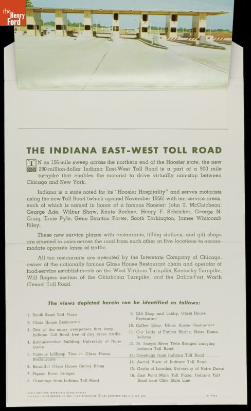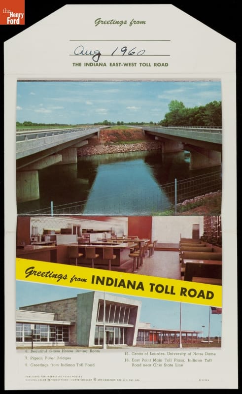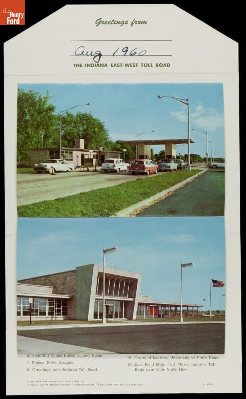 This souvenir postcard packet shows scenes along the Indiana Toll Road about 1960. Opened in 1956 and still in use today, the toll road stretches along the northernmost part of Indiana.